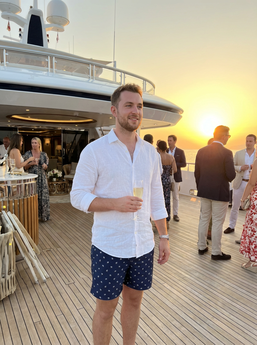model wearing shirt and swim shorts at an exclusive yacht party sunset, capturing the essence of luxury and opulence