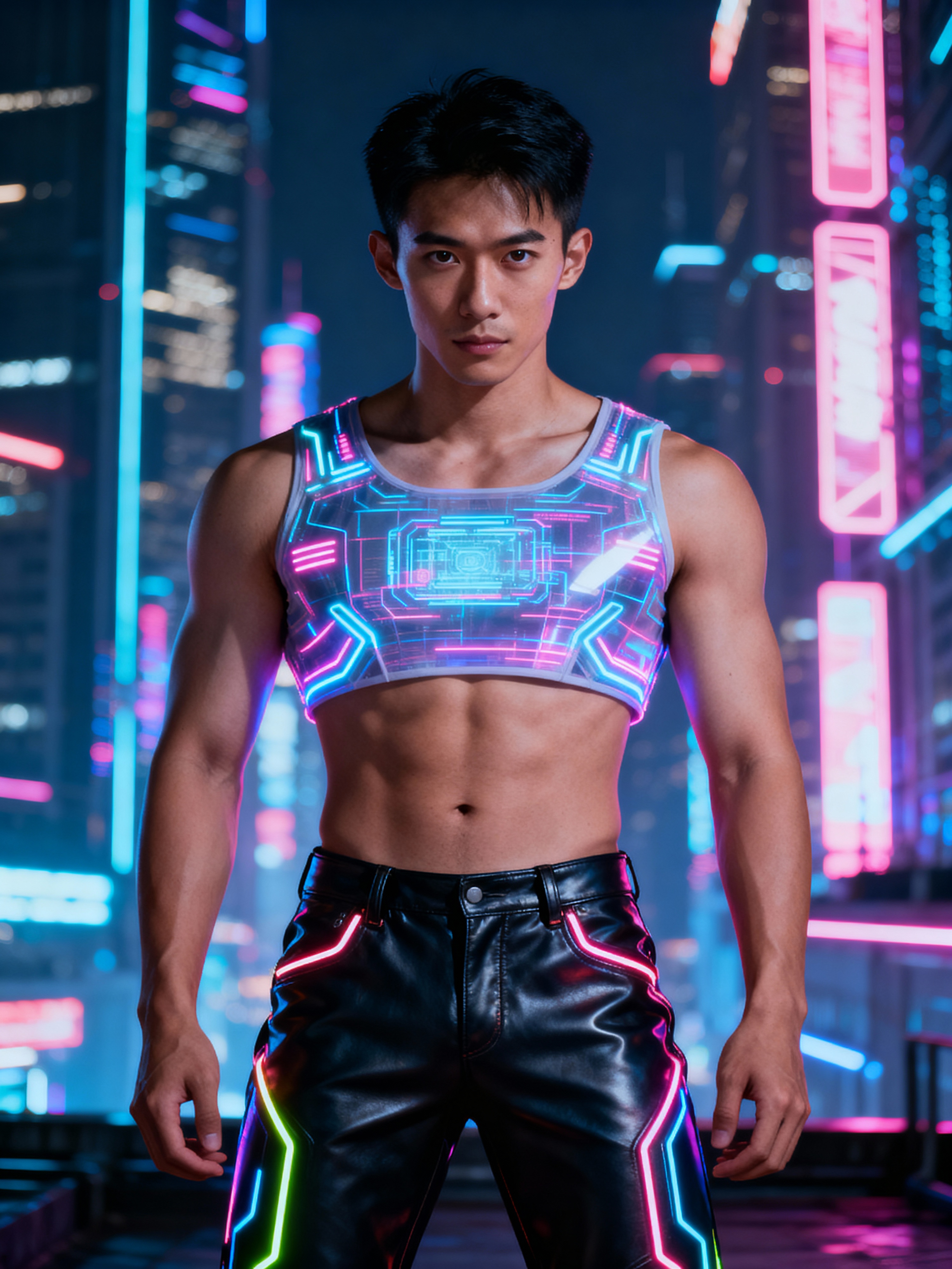 model wearing sleek leather pants with neon highlights and holographic top in a Bladerunner-inspired cityscape