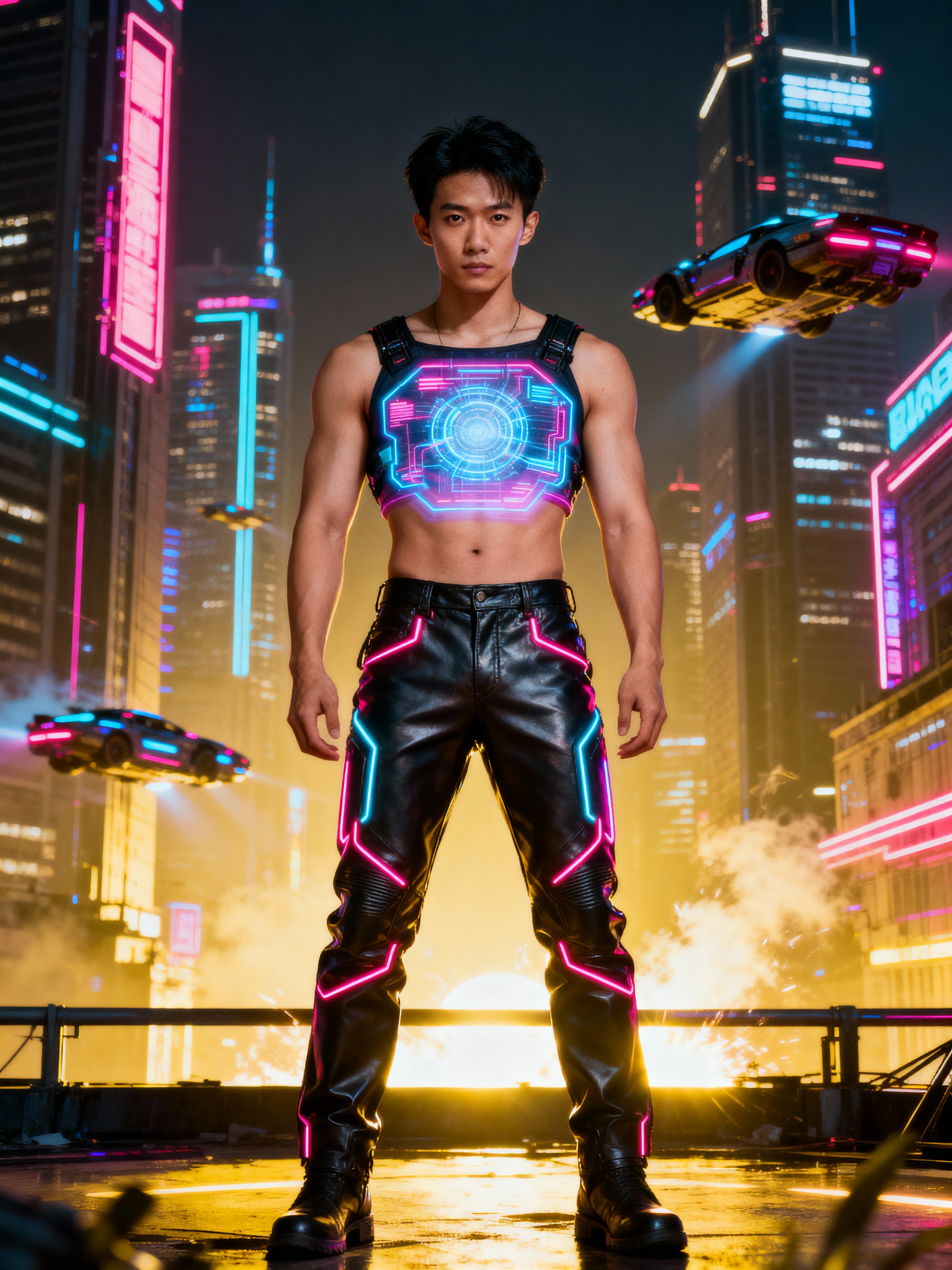 model wearing sleek leather pants with neon highlights and holographic top in a Bladerunner-inspired cityscape