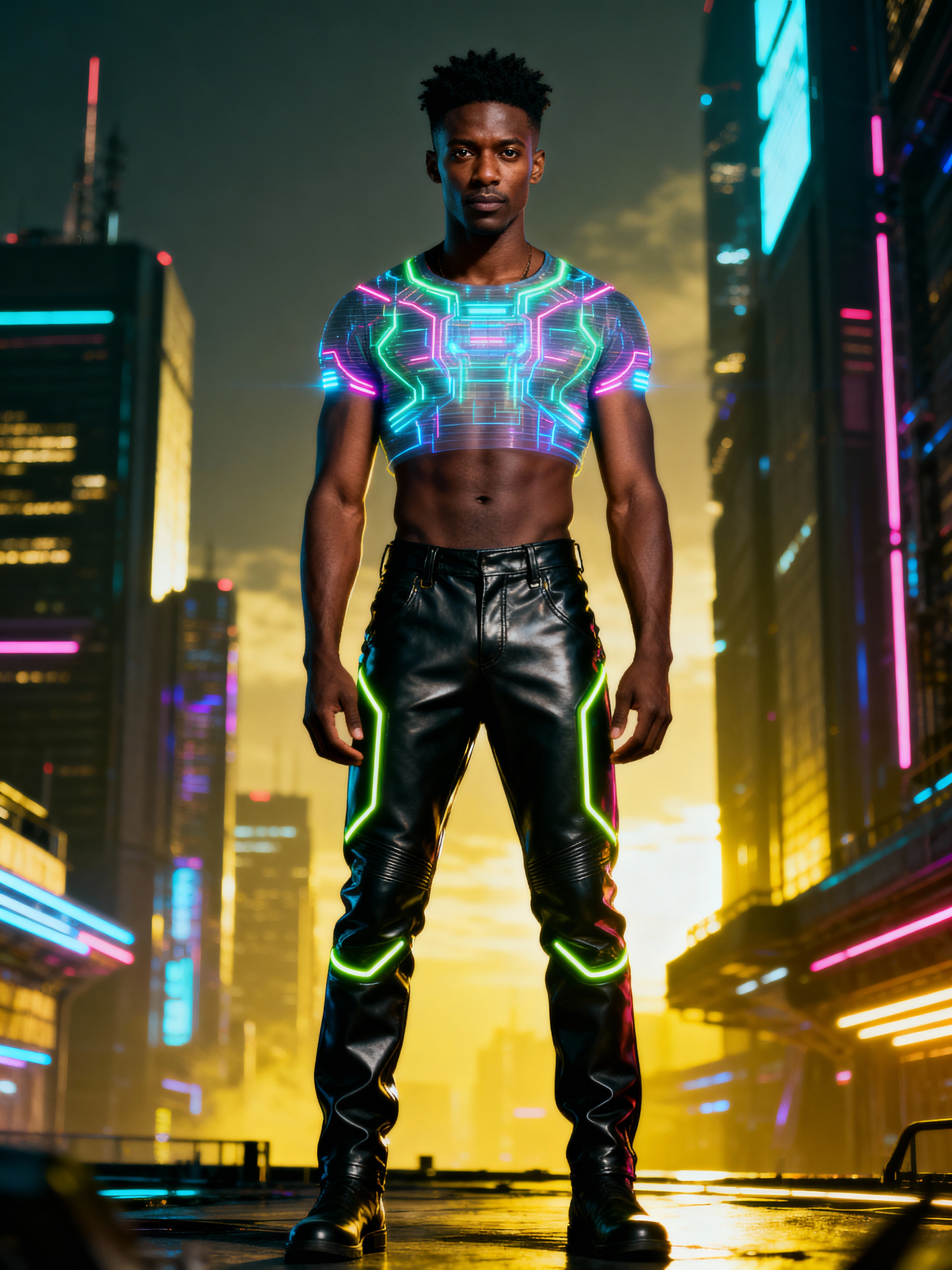 model wearing sleek leather pants with neon highlights and holographic top in a Bladerunner-inspired cityscape