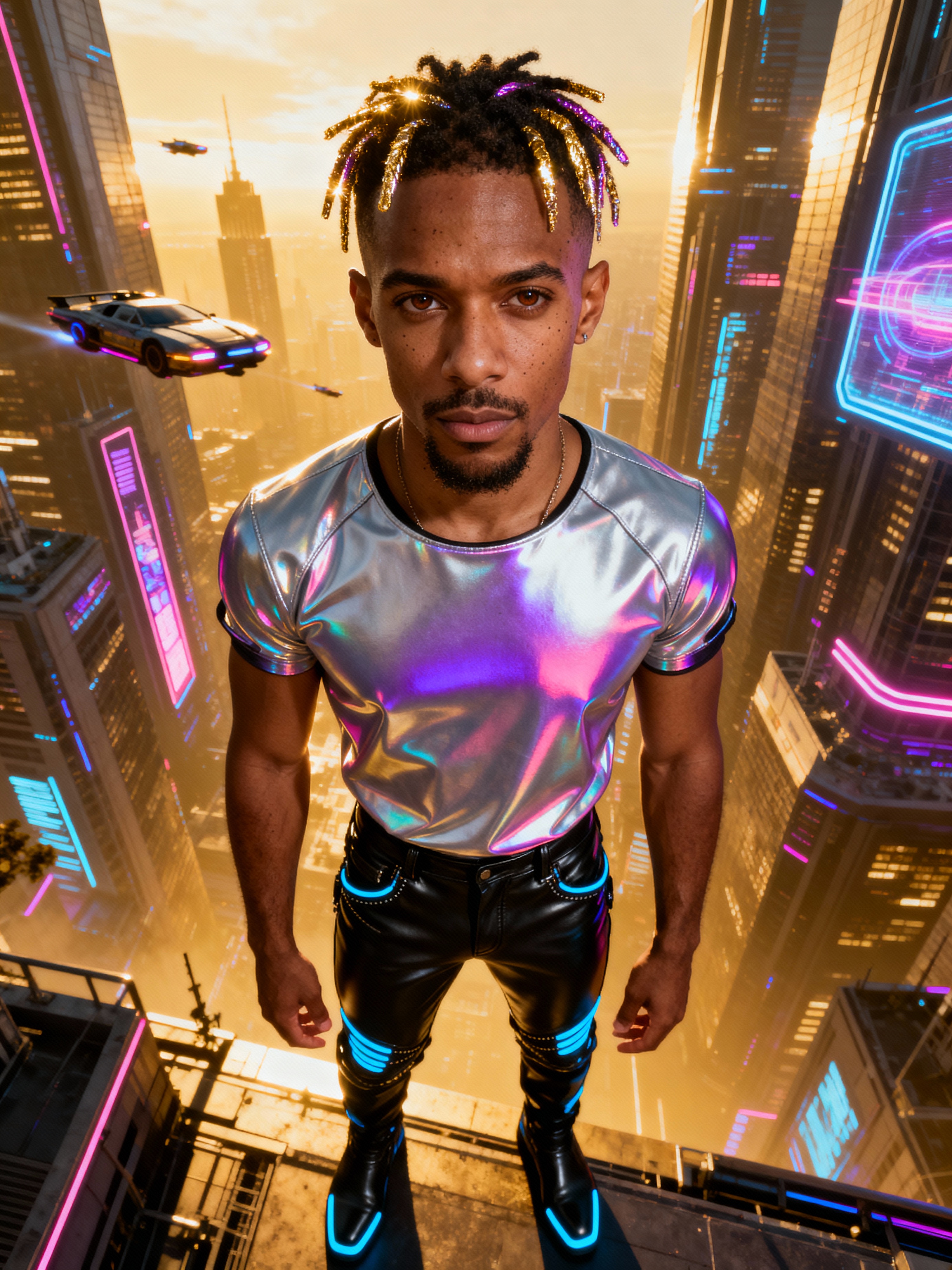 model wearing sleek leather pants with neon highlights and holographic top in a Bladerunner-inspired cityscape
