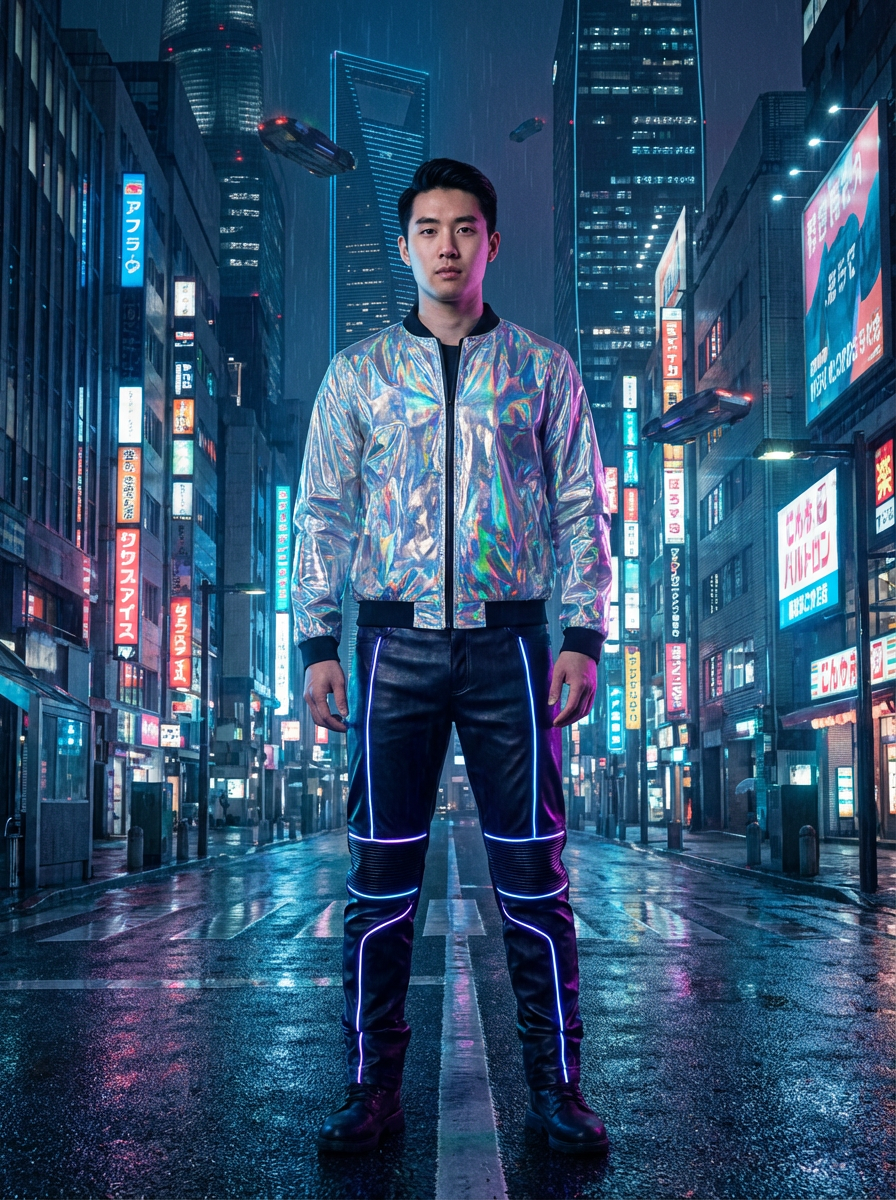 model wearing sleek leather pants with neon highlights and holographic top in a Bladerunner-inspired cityscape