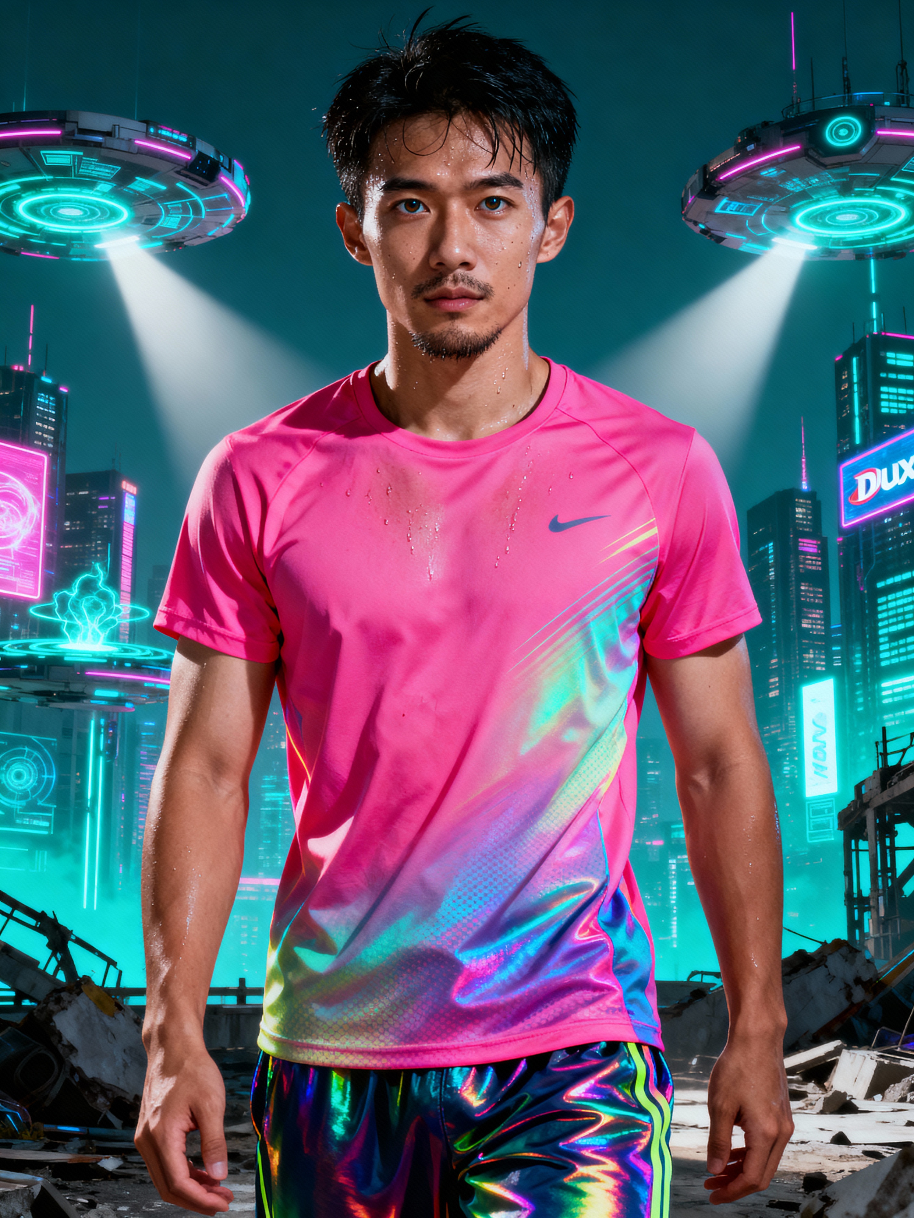 model wearing sporty neon t-shirt and holographic joggers in a dystopian digital cityscape