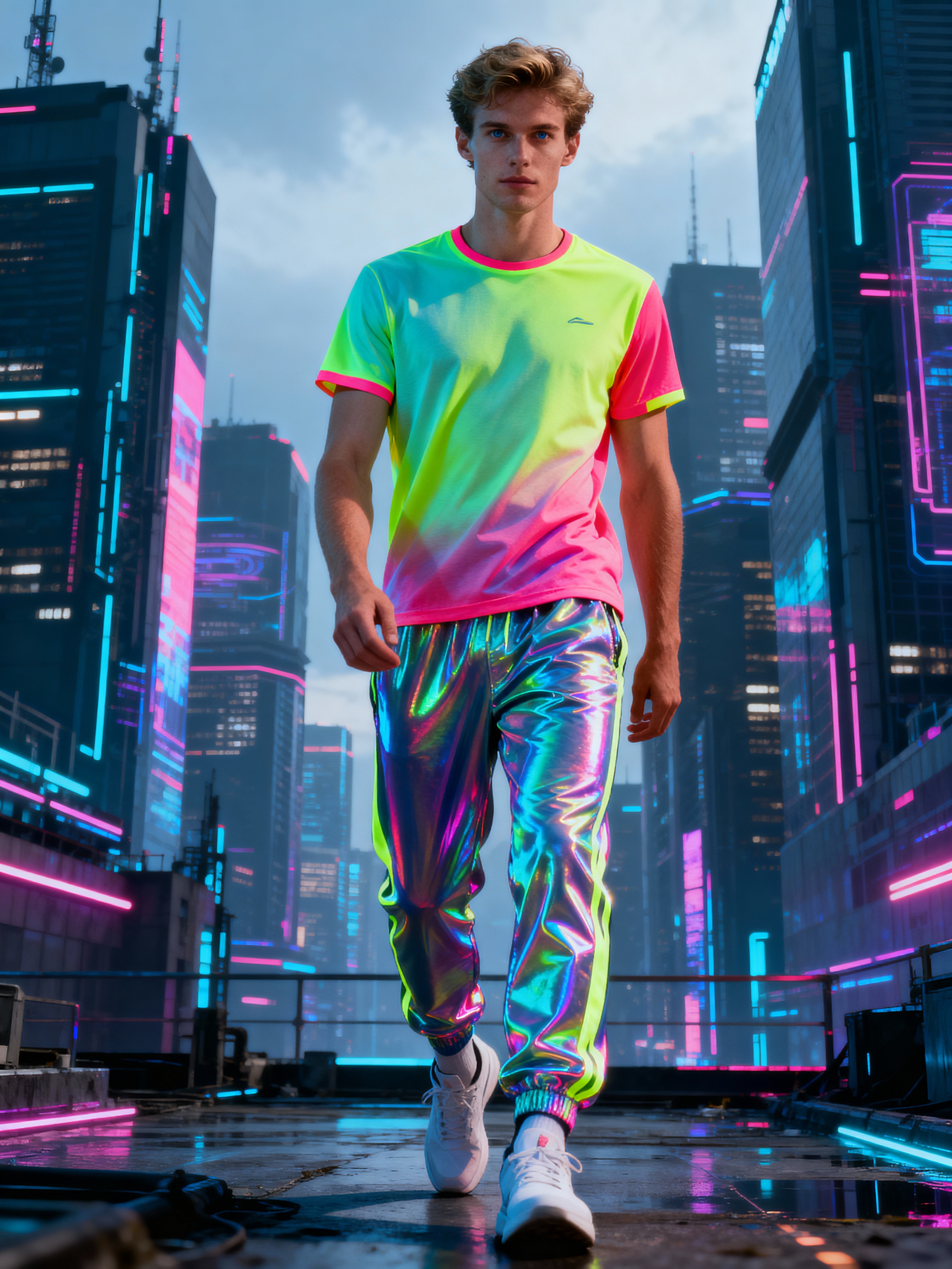 model wearing sporty neon t-shirt and holographic joggers in a dystopian digital cityscape