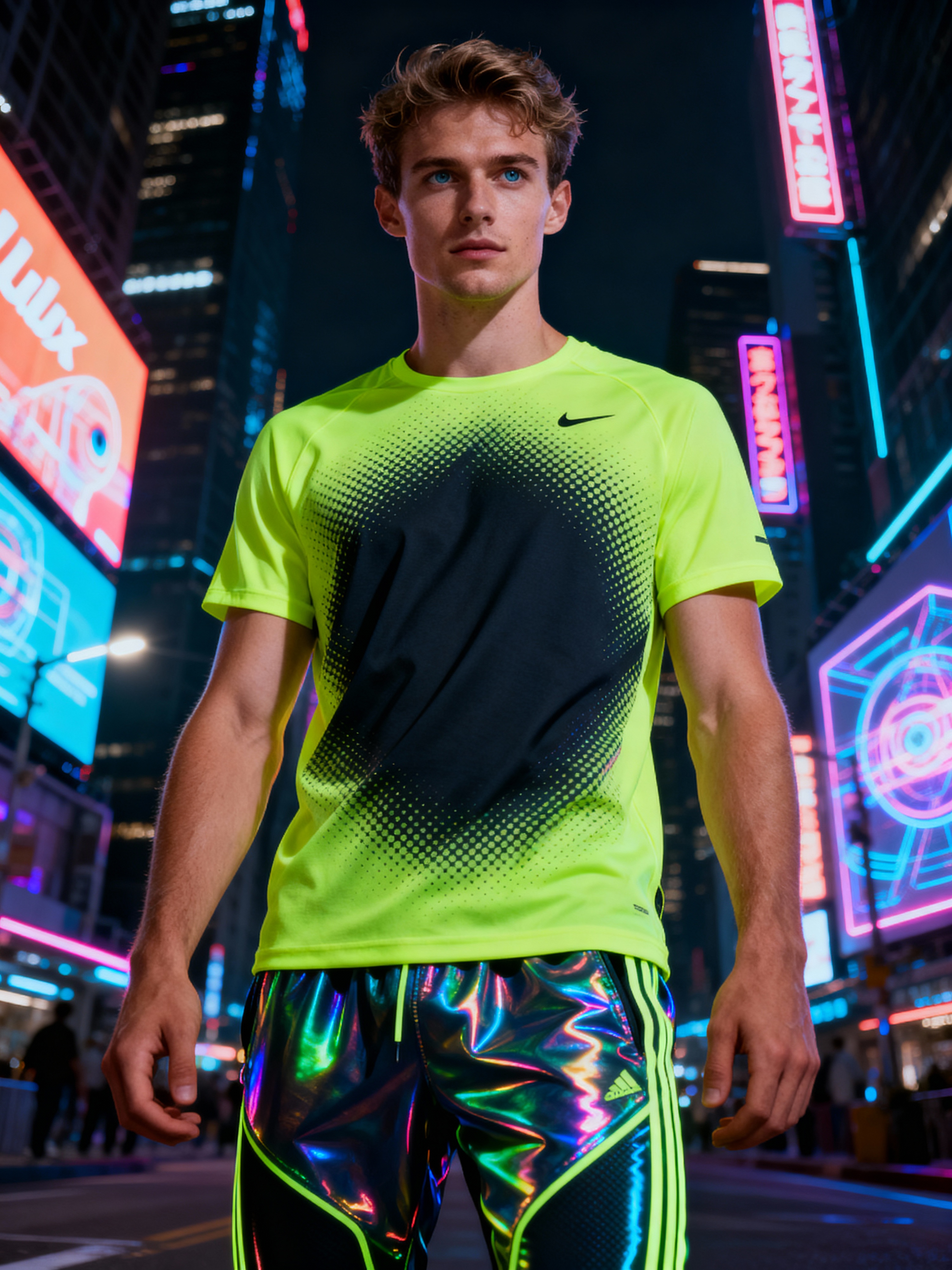 model wearing sporty neon t-shirt and holographic joggers in a dystopian digital cityscape