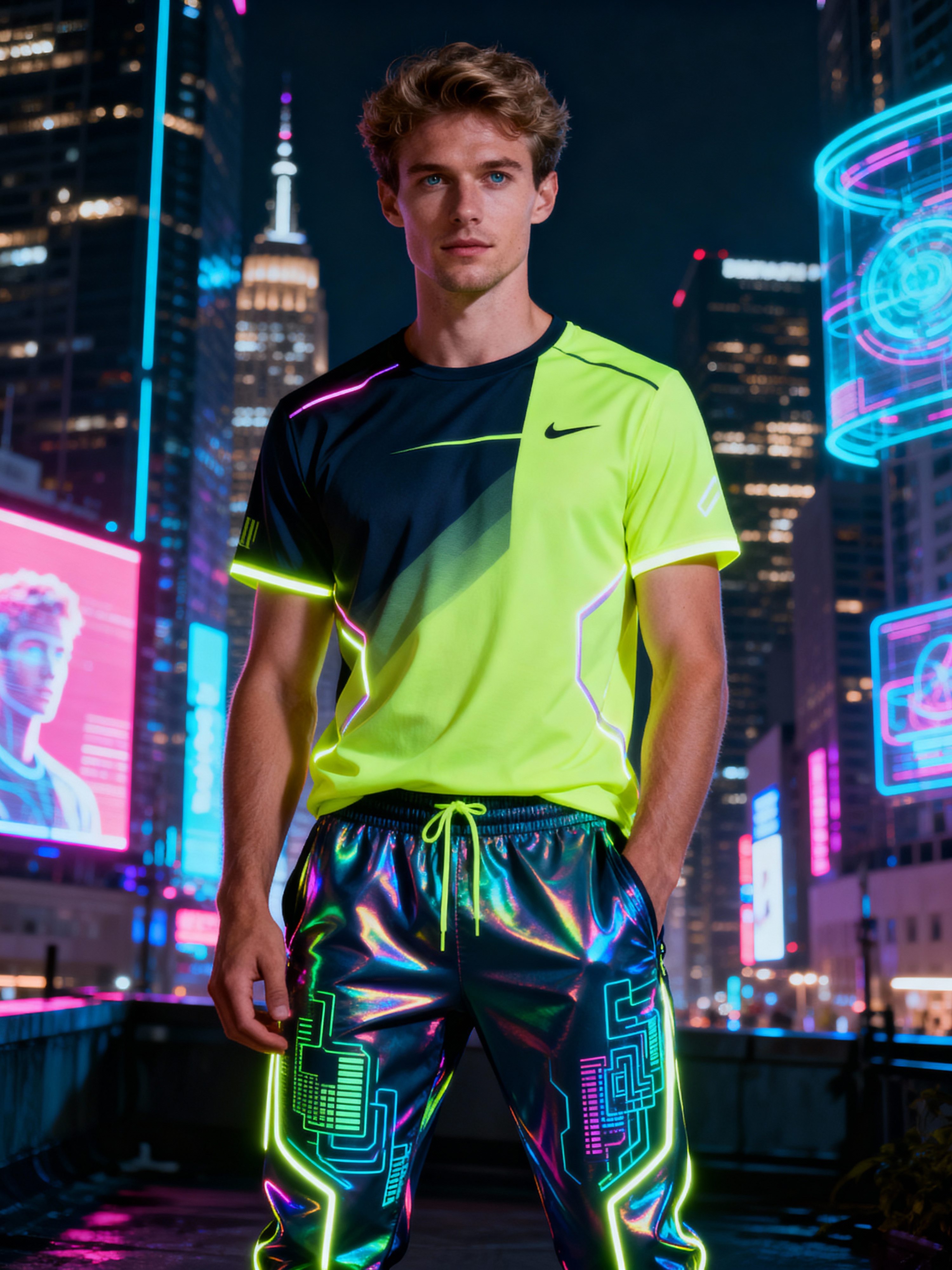 model wearing sporty neon t-shirt and holographic joggers in a dystopian digital cityscape