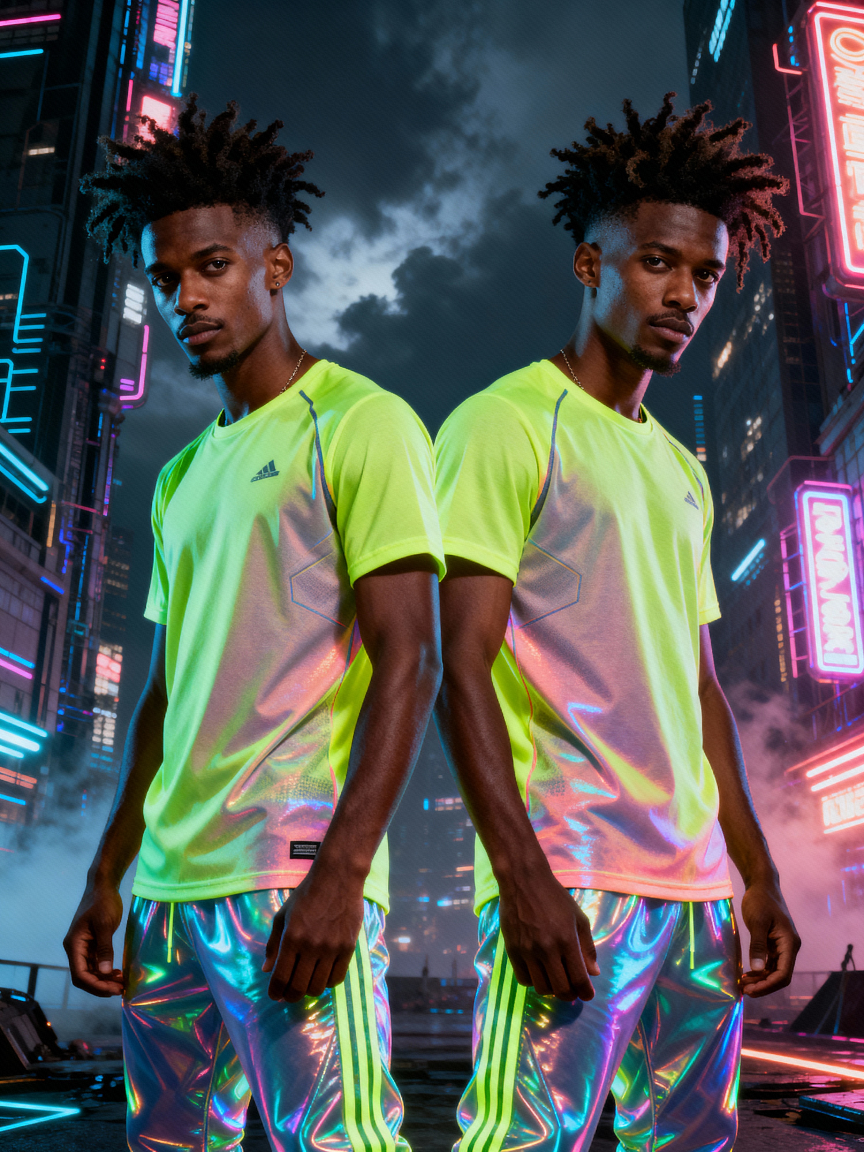 model wearing sporty neon t-shirt and holographic joggers in a dystopian digital cityscape
