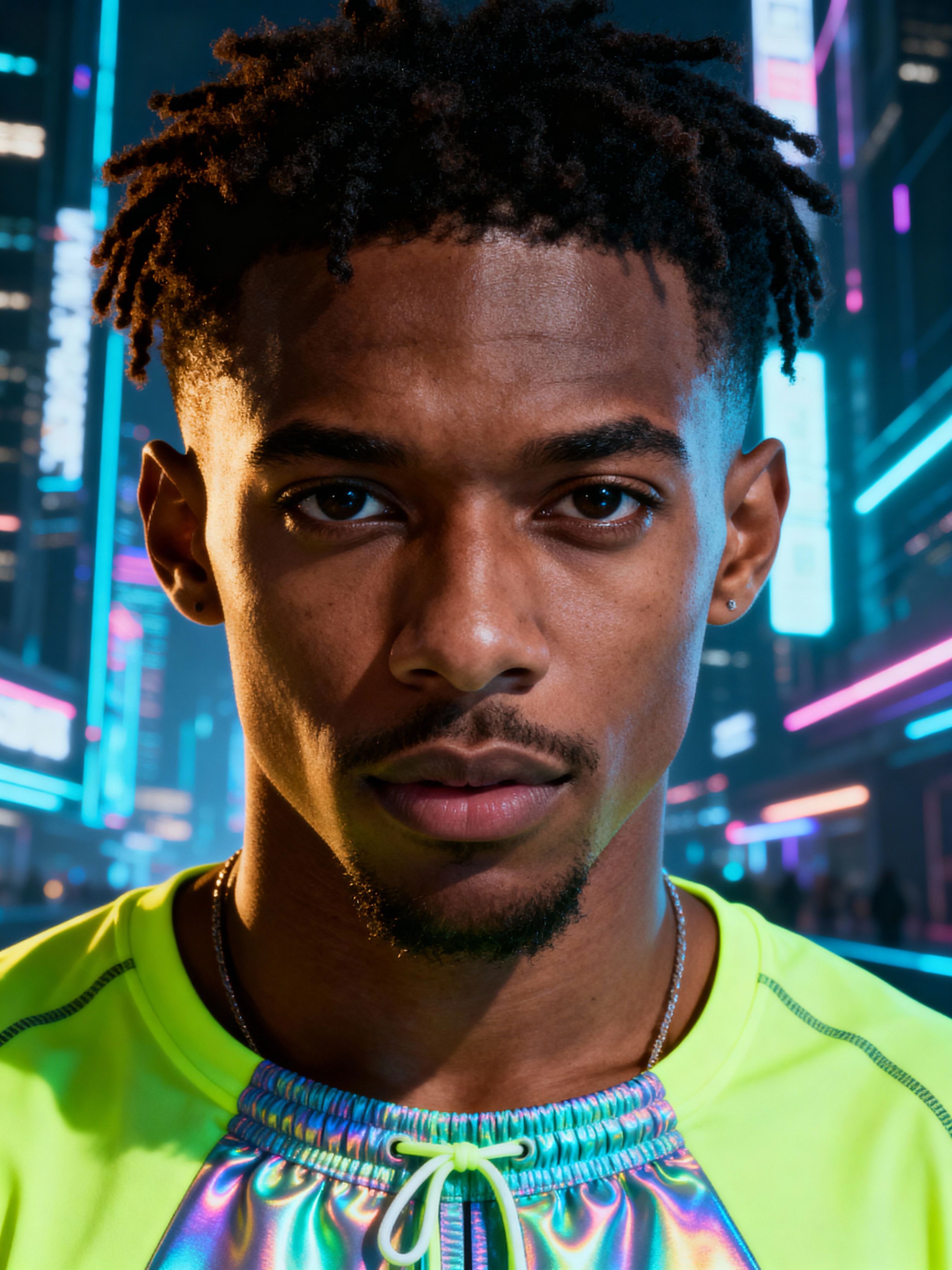 model wearing sporty neon t-shirt and holographic joggers in a dystopian digital cityscape