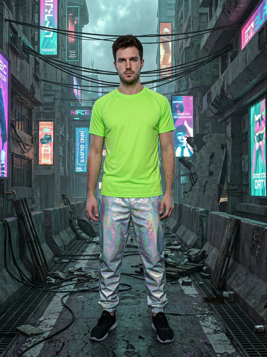 model wearing sporty neon t-shirt and holographic joggers in a dystopian digital cityscape