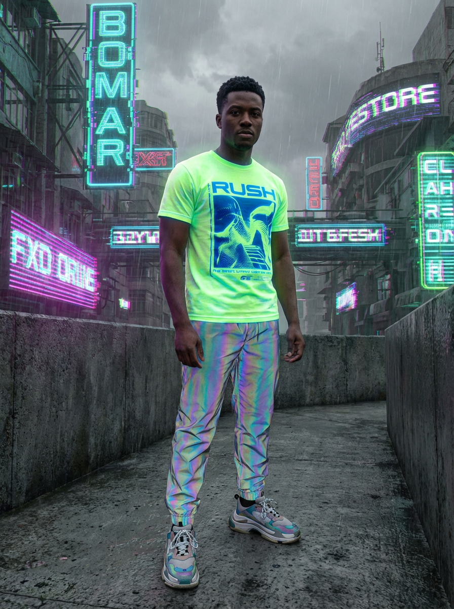 model wearing sporty neon t-shirt and holographic joggers in a dystopian digital cityscape