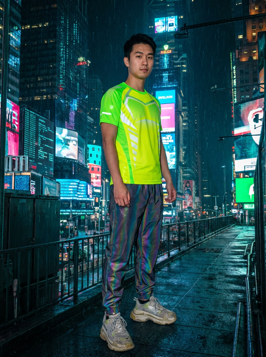 model wearing sporty neon t-shirt and holographic joggers in a dystopian digital cityscape