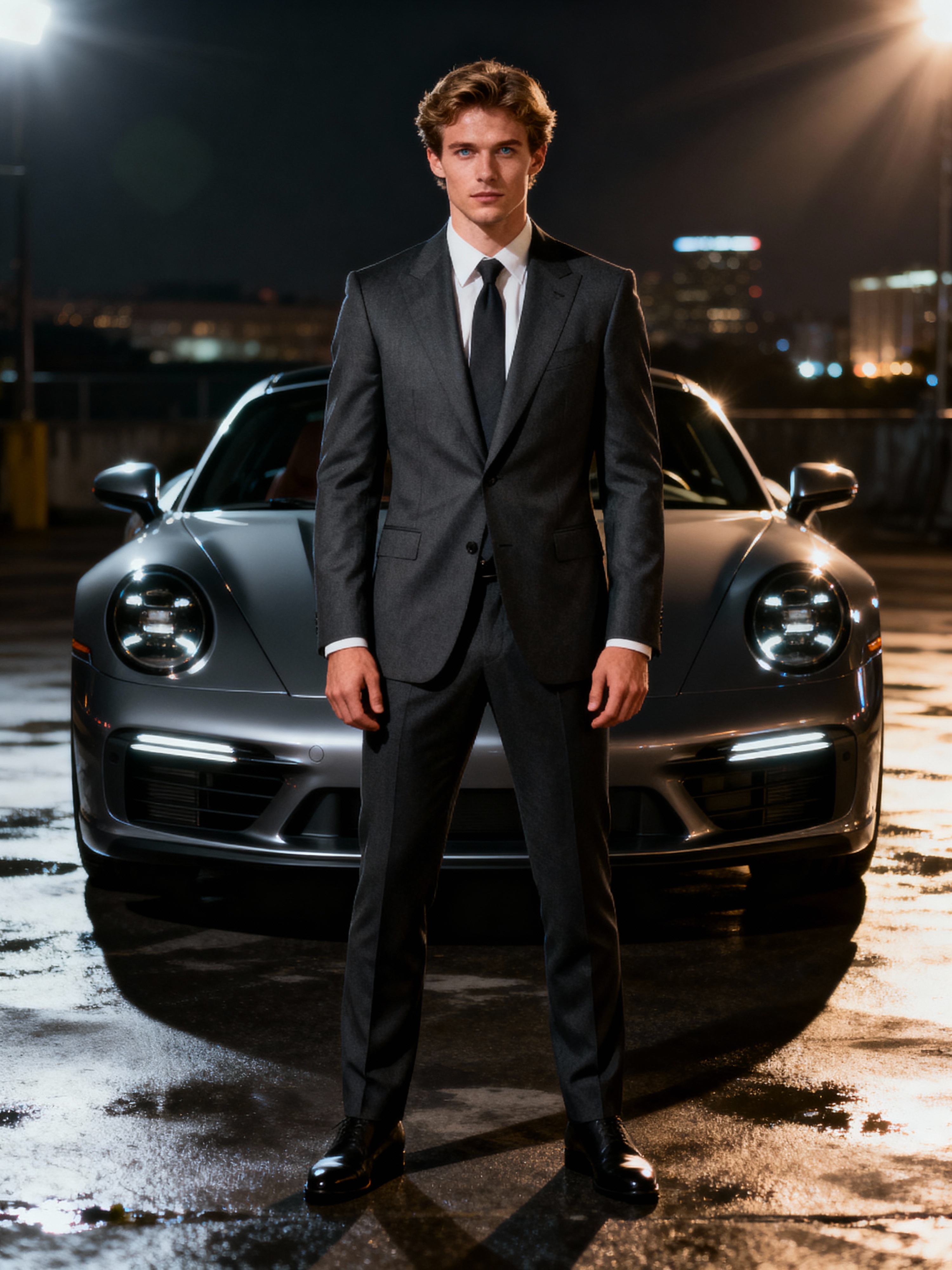 model wearing suit posing in front of a sports car