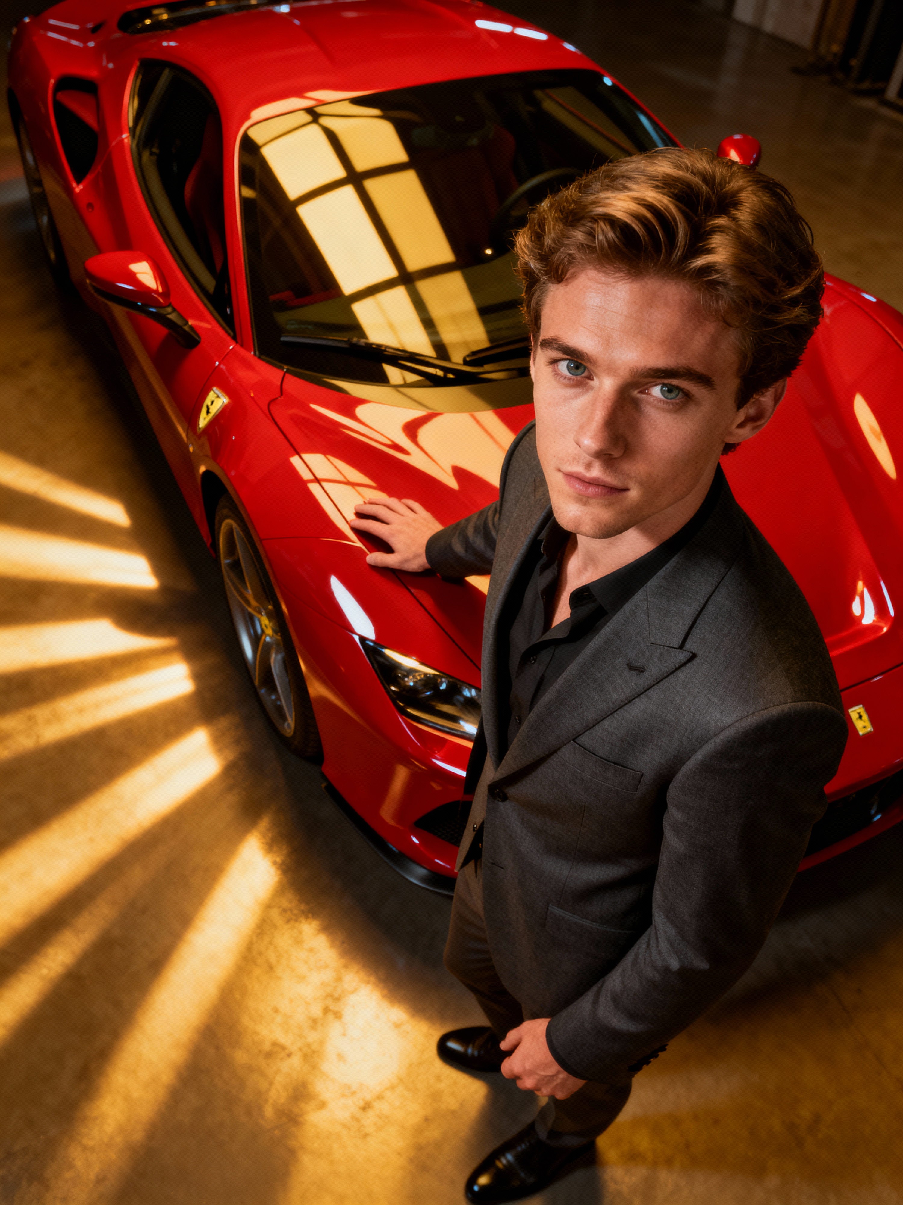 model wearing suit posing in front of a sports car