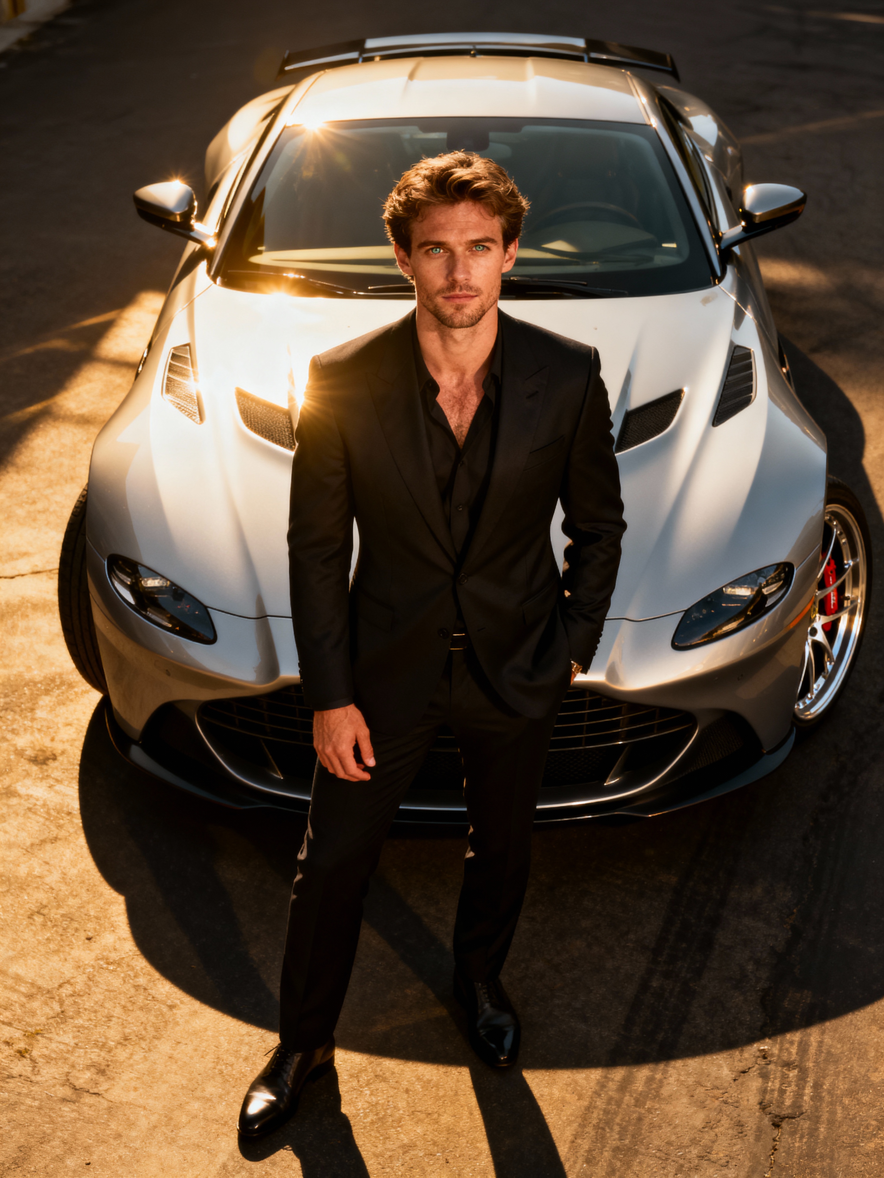 model wearing suit posing in front of a sports car