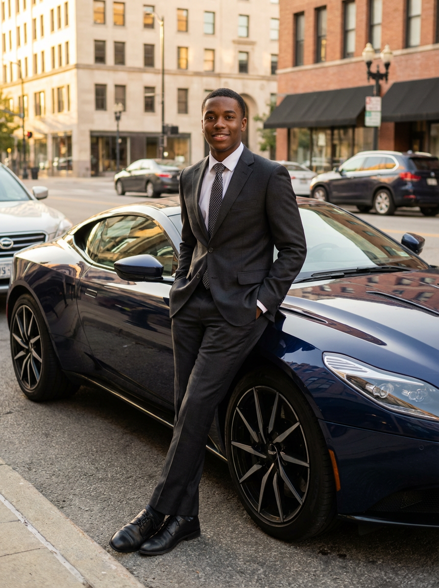 model wearing suit posing in front of a sports car