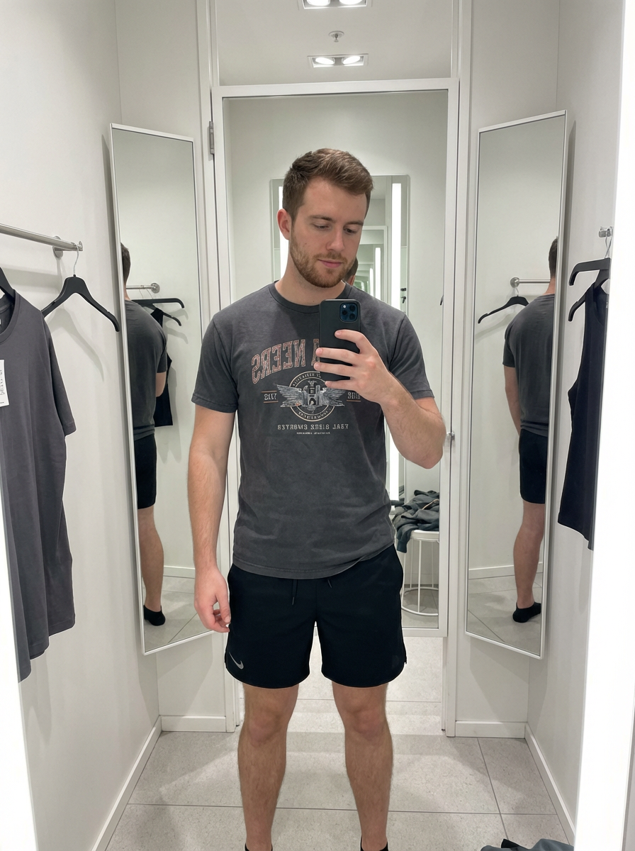 model wearing t-shirt and gym shorts in try on fashion shoot for fast fashion brand