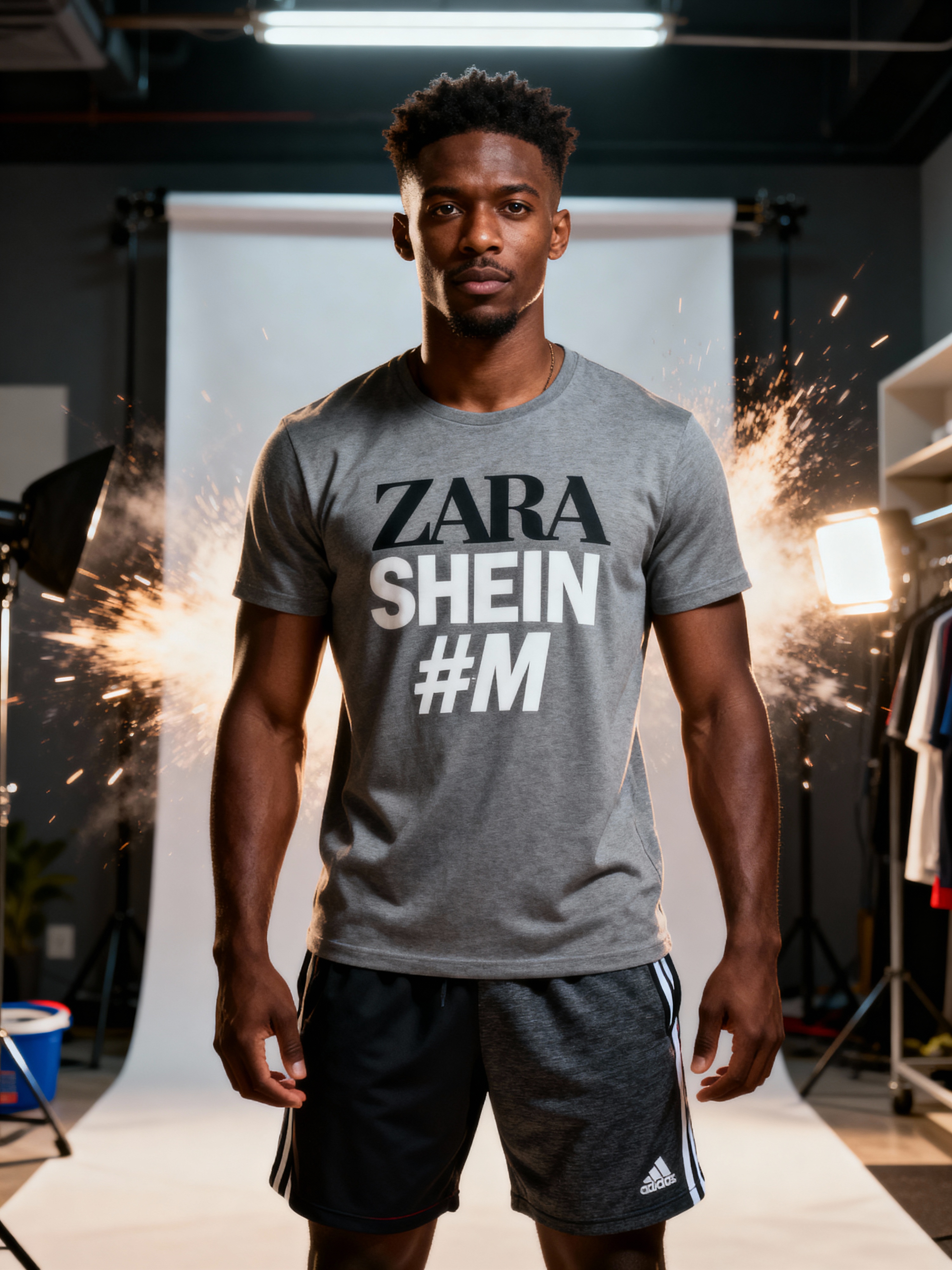 model wearing t-shirt and gym shorts in try on fashion shoot for Zara Shein H&M