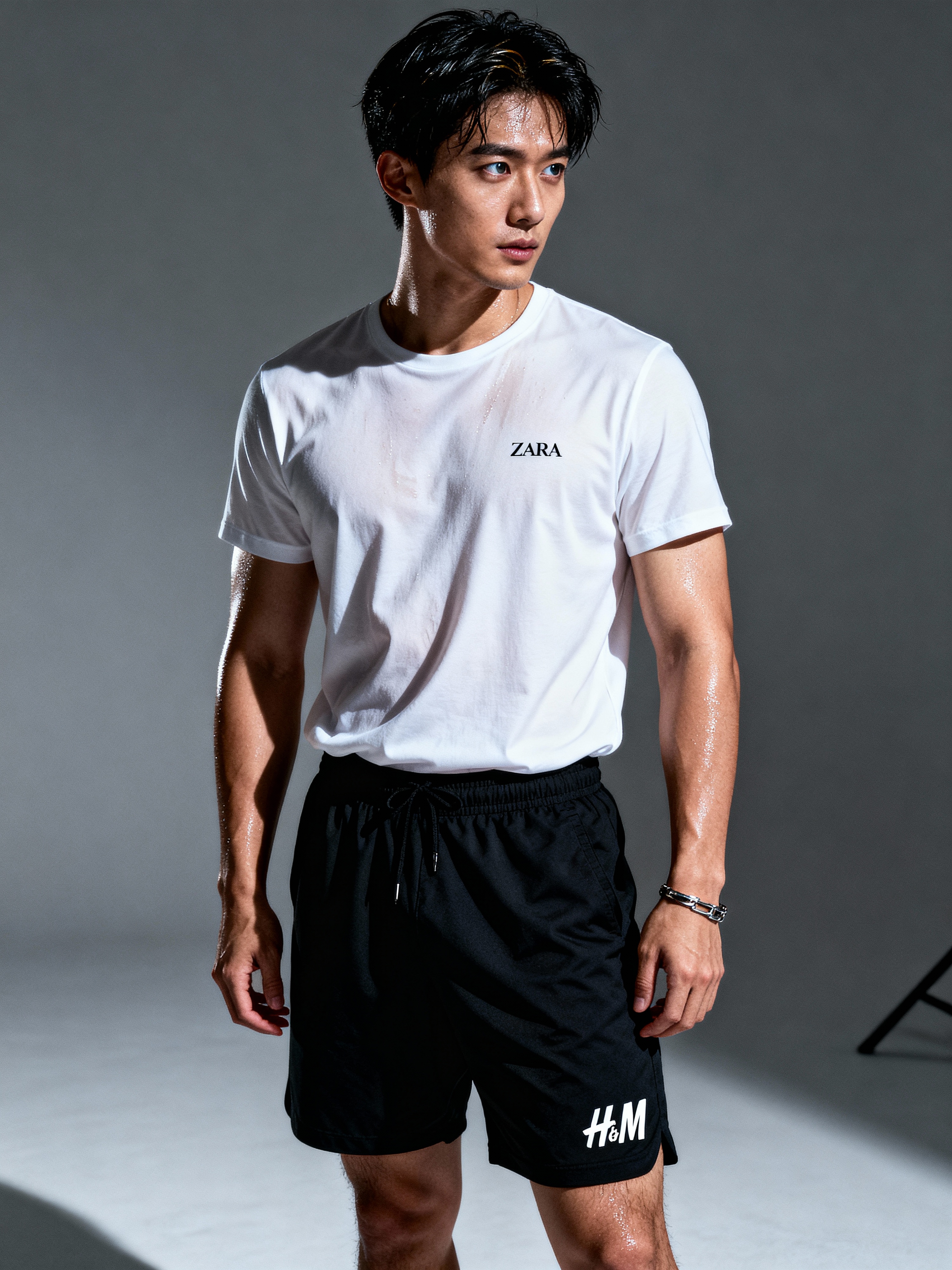 model wearing t-shirt and gym shorts in try on fashion shoot for Zara Shein H&M