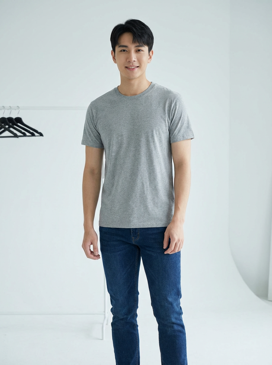 model wearing t-shirt and pants in try on fashion shoot for Fast fashion brand