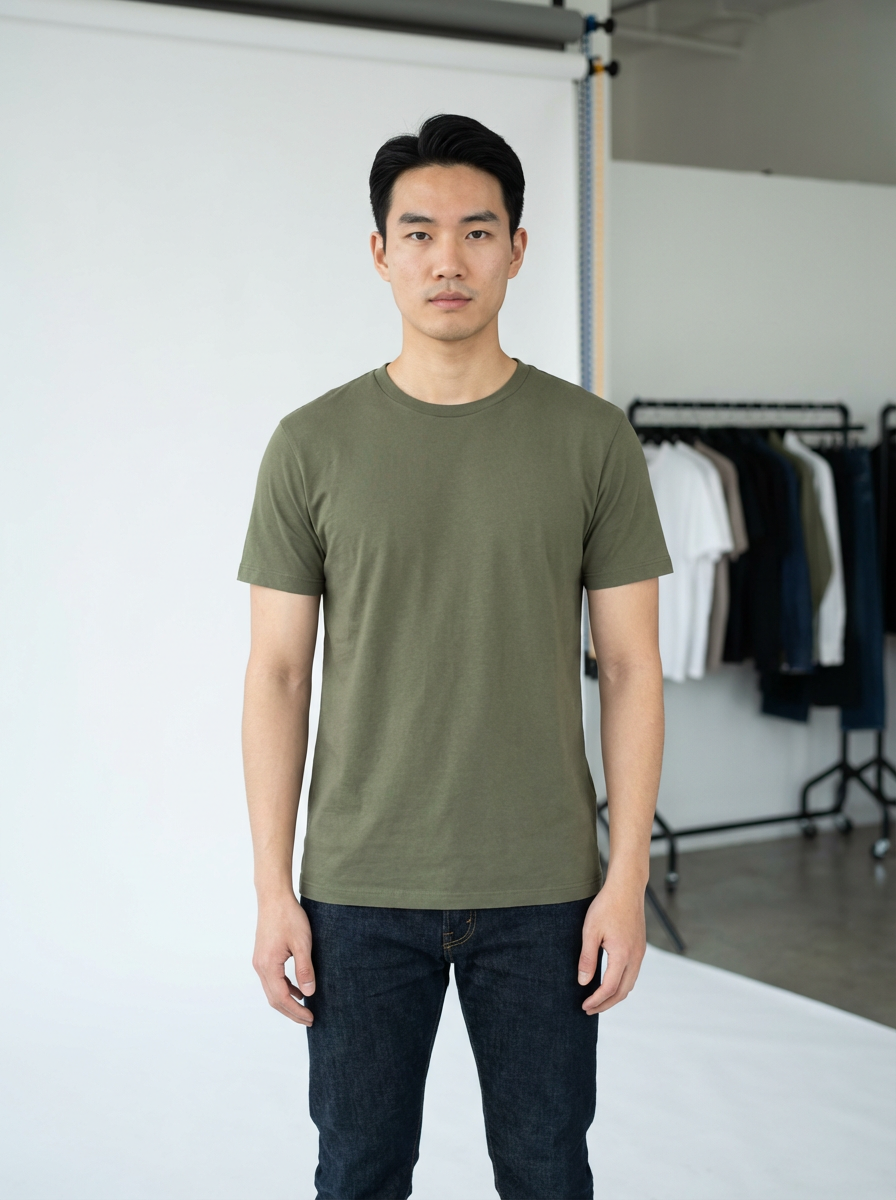 model wearing t-shirt and pants in try on fashion shoot for Fast fashion brand