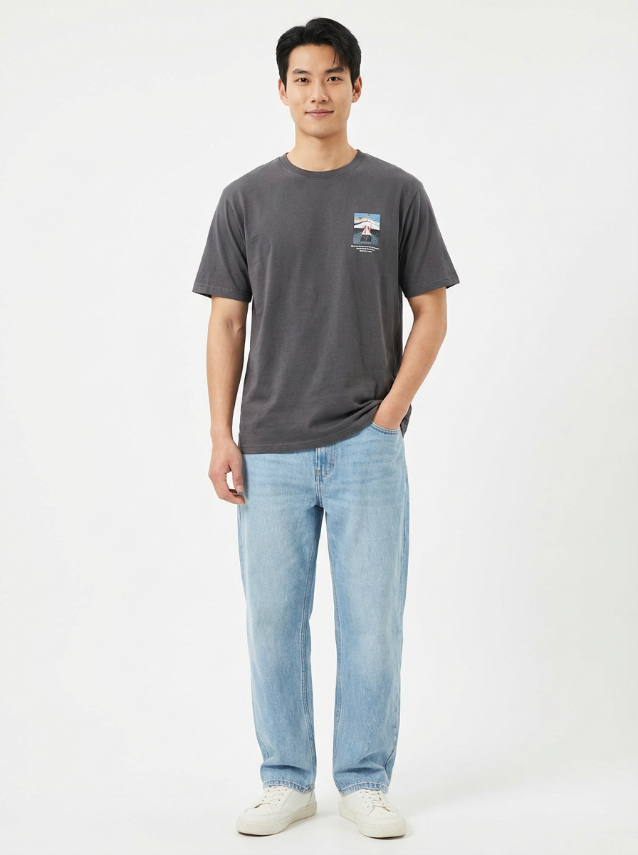 model wearing t-shirt and pants in try on fashion shoot for Fast fashion brand