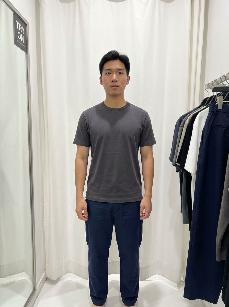 model wearing t-shirt and pants in try on fashion shoot for Fast fashion brand