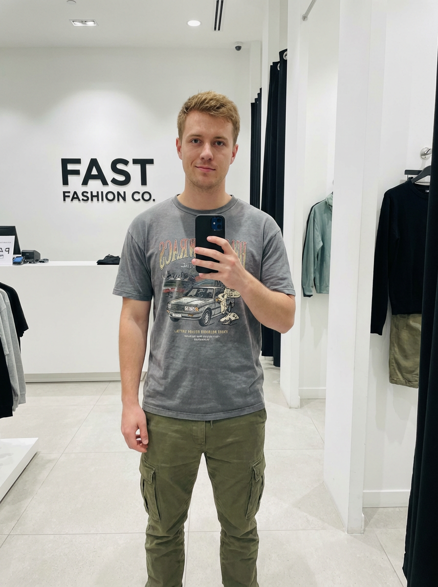 model wearing t-shirt and pants in try on fashion shoot for Fast fashion brand