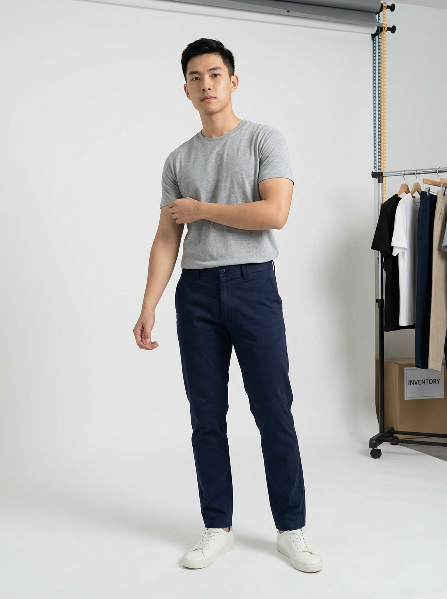 model wearing t-shirt and pants in try on fashion shoot for Fast fashion brand