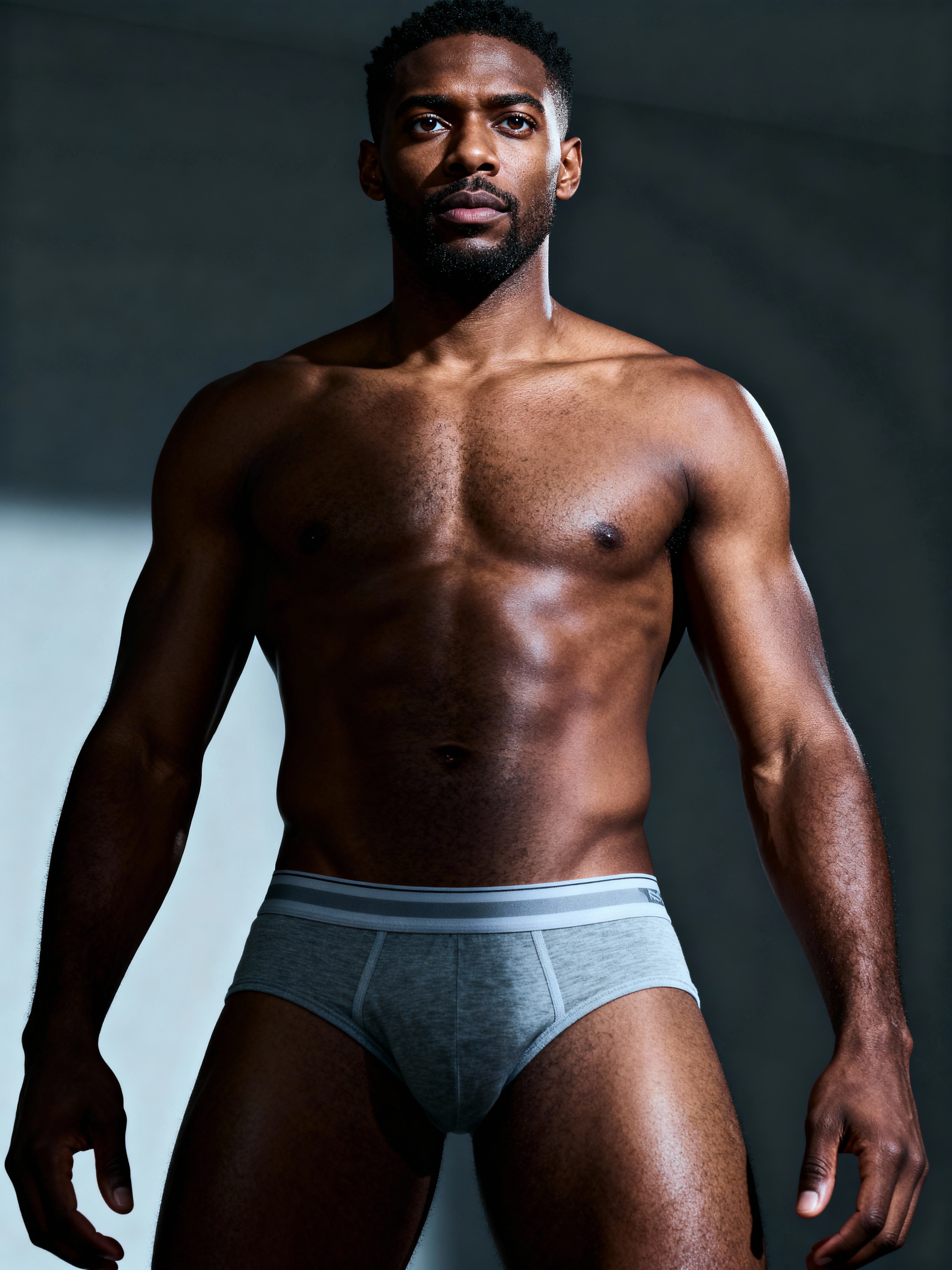 model wearing underwear in Men's Health centerfold photoshoot. intact eyes, symmetrical eyes, realistic skin texture. hyper realistic eyes. photorealistic