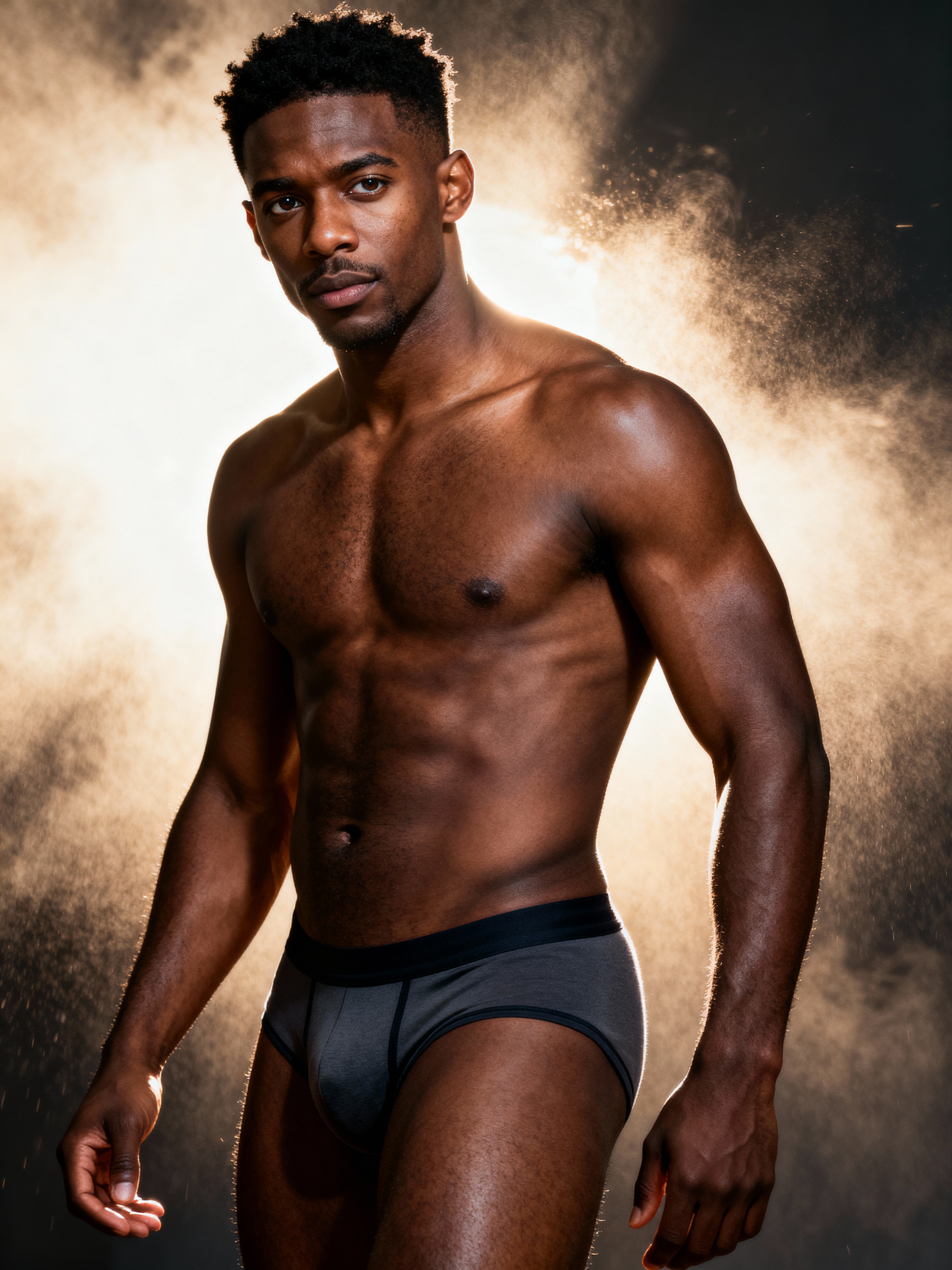 model wearing underwear in Men's Health centerfold photoshoot. intact eyes, symmetrical eyes, realistic skin texture. hyper realistic eyes. photorealistic