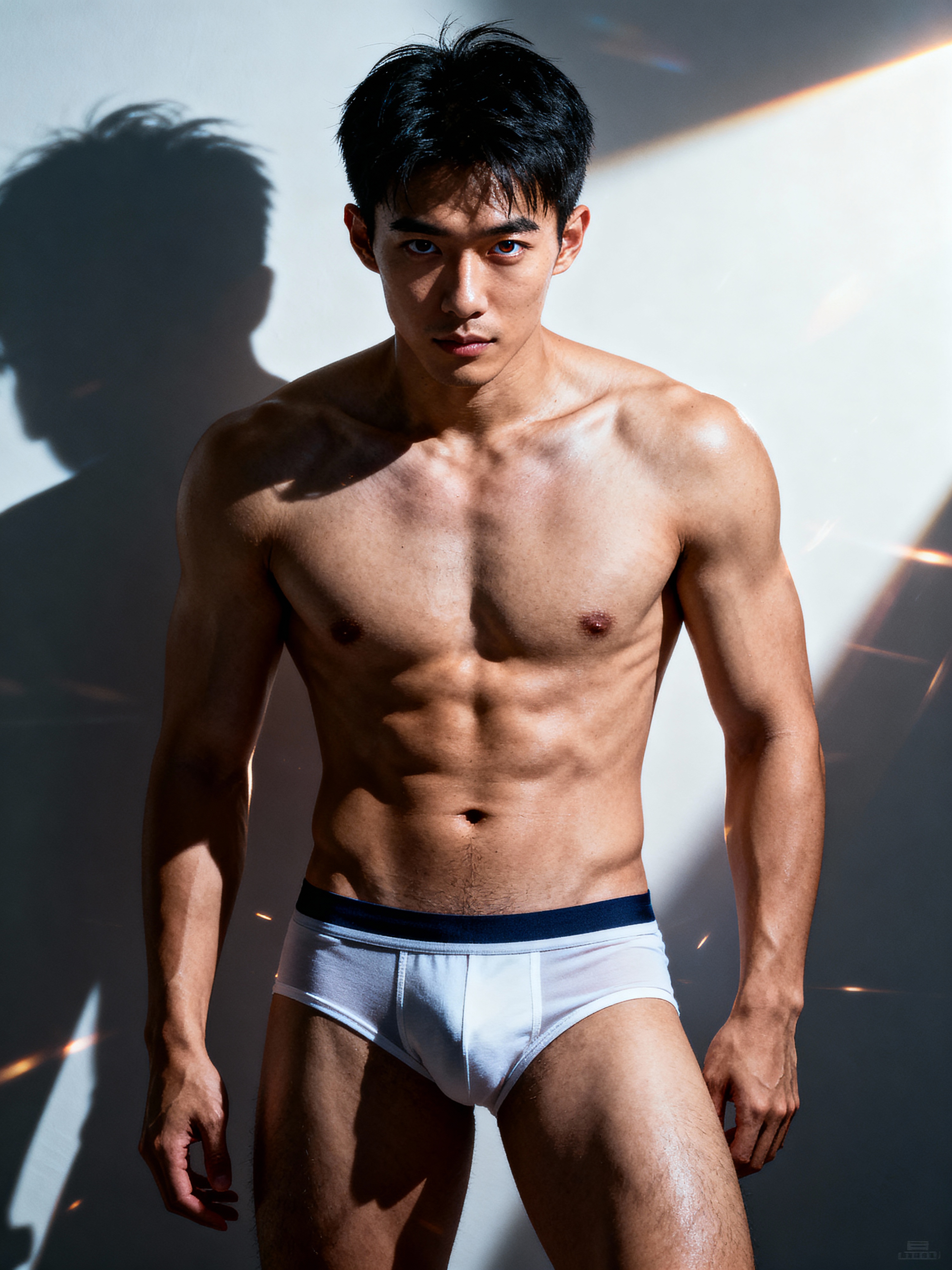 model wearing underwear in Men's Health centerfold photoshoot. intact eyes, symmetrical eyes, realistic skin texture. hyper realistic eyes. photorealistic