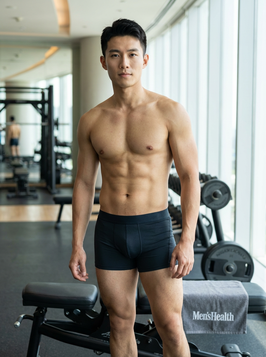 model wearing underwear in Men's Health centerfold photoshoot. intact eyes, symmetrical eyes, realistic skin texture. hyper realistic eyes. photorealistic