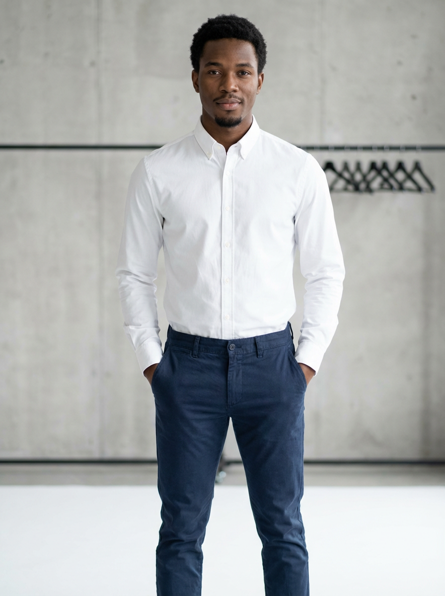 model wearing white collar shirt in try on fashion shoot for Fast fashion brand