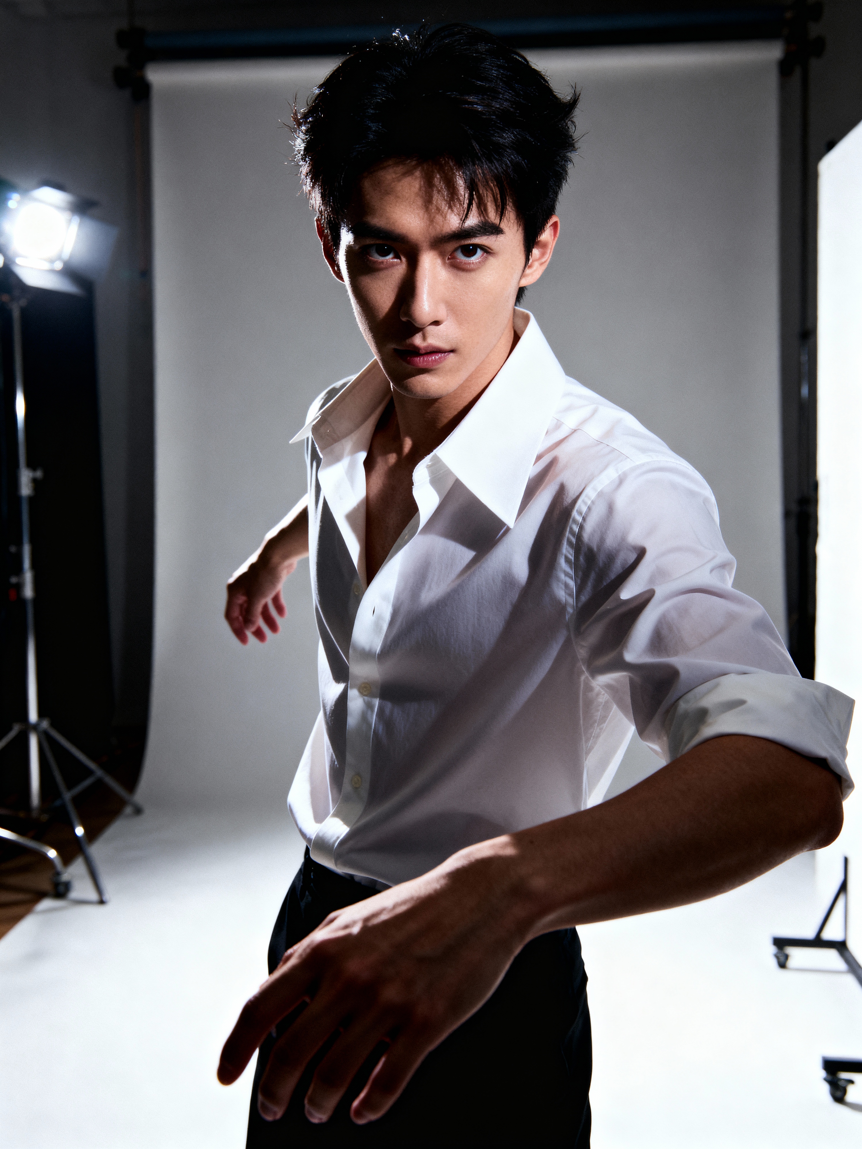 model wearing white collar shirt in try on fashion shoot for Zara Shein H&M