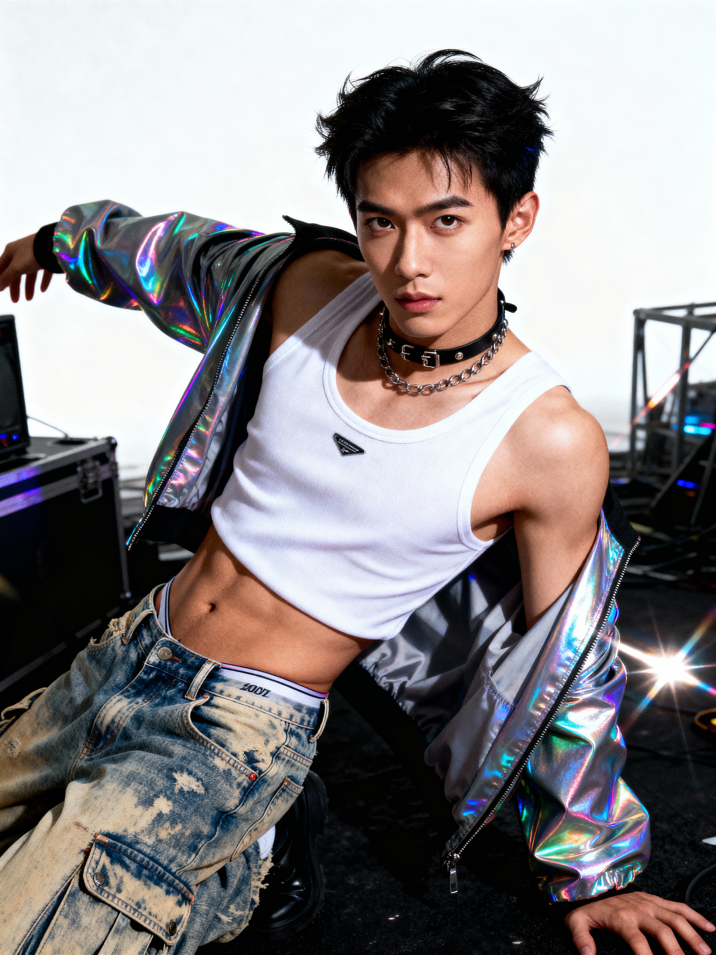 model wearing Y2K aesthetic, 2000s fashion, aughts style, noughties style, grunge or 2000s style, oversized washed out style, baggy pants, low rise pants or cargo pants, crop top, Choker, metallic glossy, iridescent fabrics, posing for photo