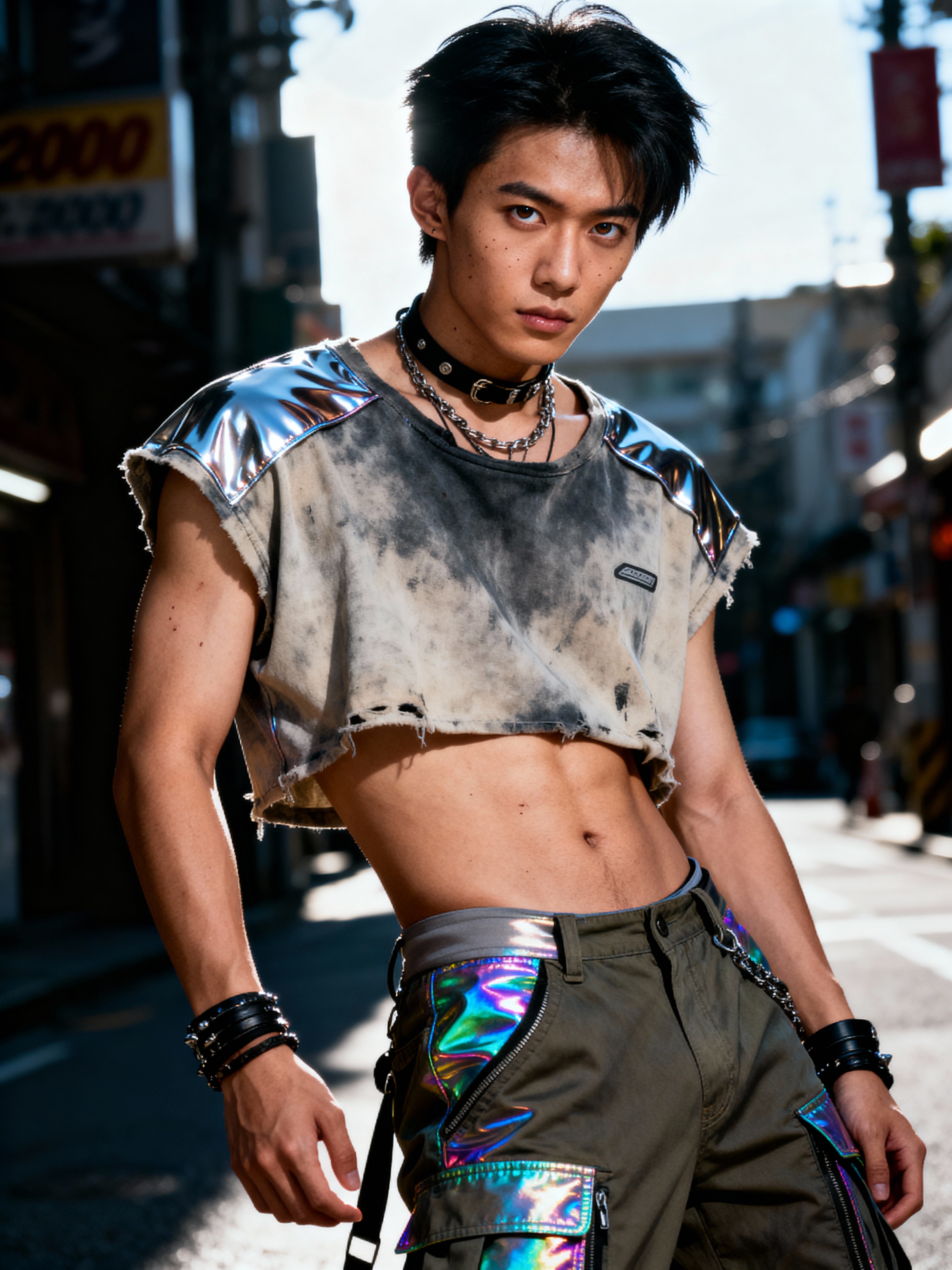 model wearing Y2K aesthetic, 2000s fashion, aughts style, noughties style, grunge or 2000s style, oversized washed out style, baggy pants, low rise pants or cargo pants, crop top, Choker, metallic glossy, iridescent fabrics, posing for photo