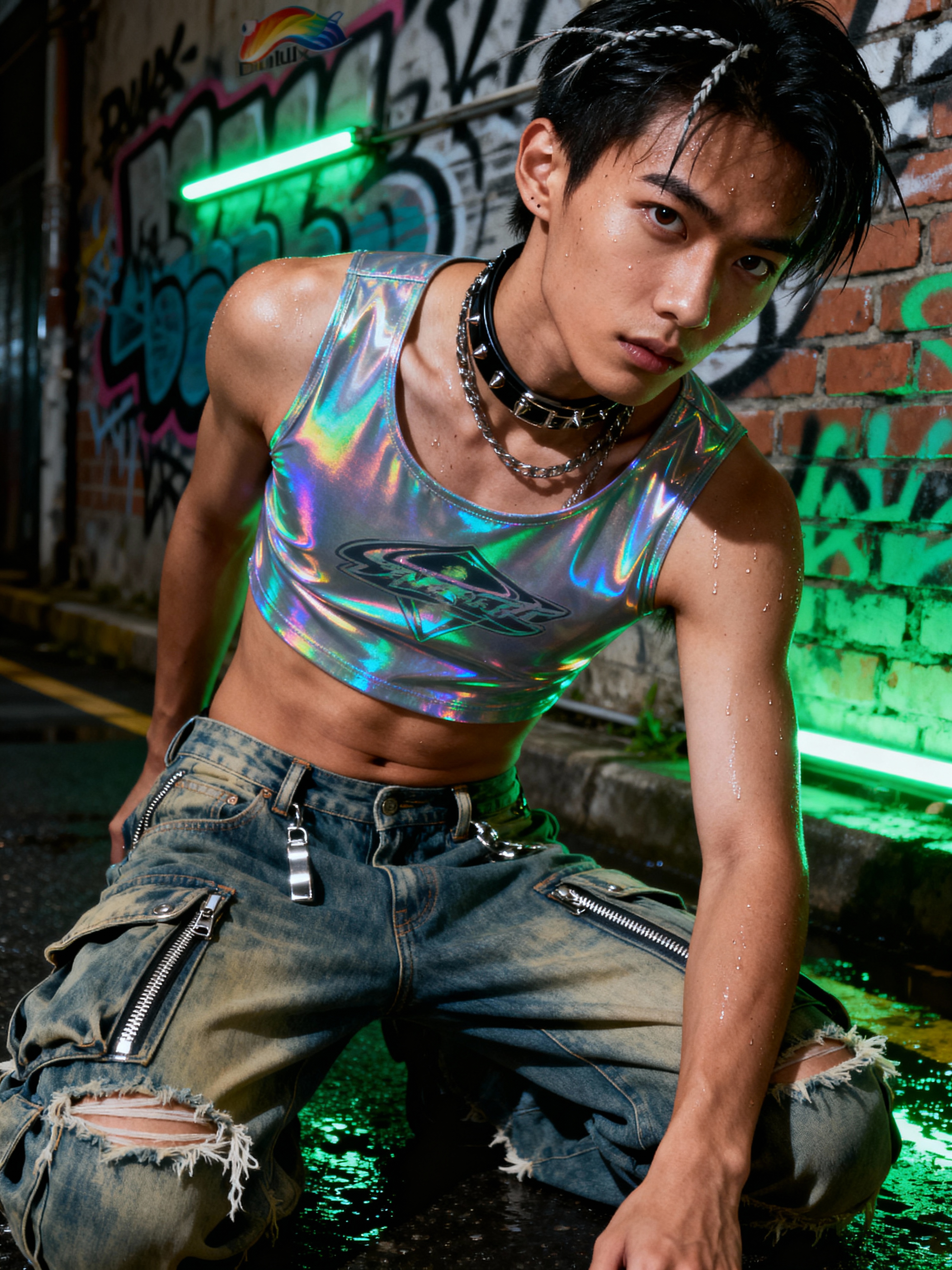 model wearing Y2K aesthetic, 2000s fashion, aughts style, noughties style, grunge or 2000s style, oversized washed out style, baggy pants, low rise pants or cargo pants, crop top, Choker, metallic glossy, iridescent fabrics, posing for photo