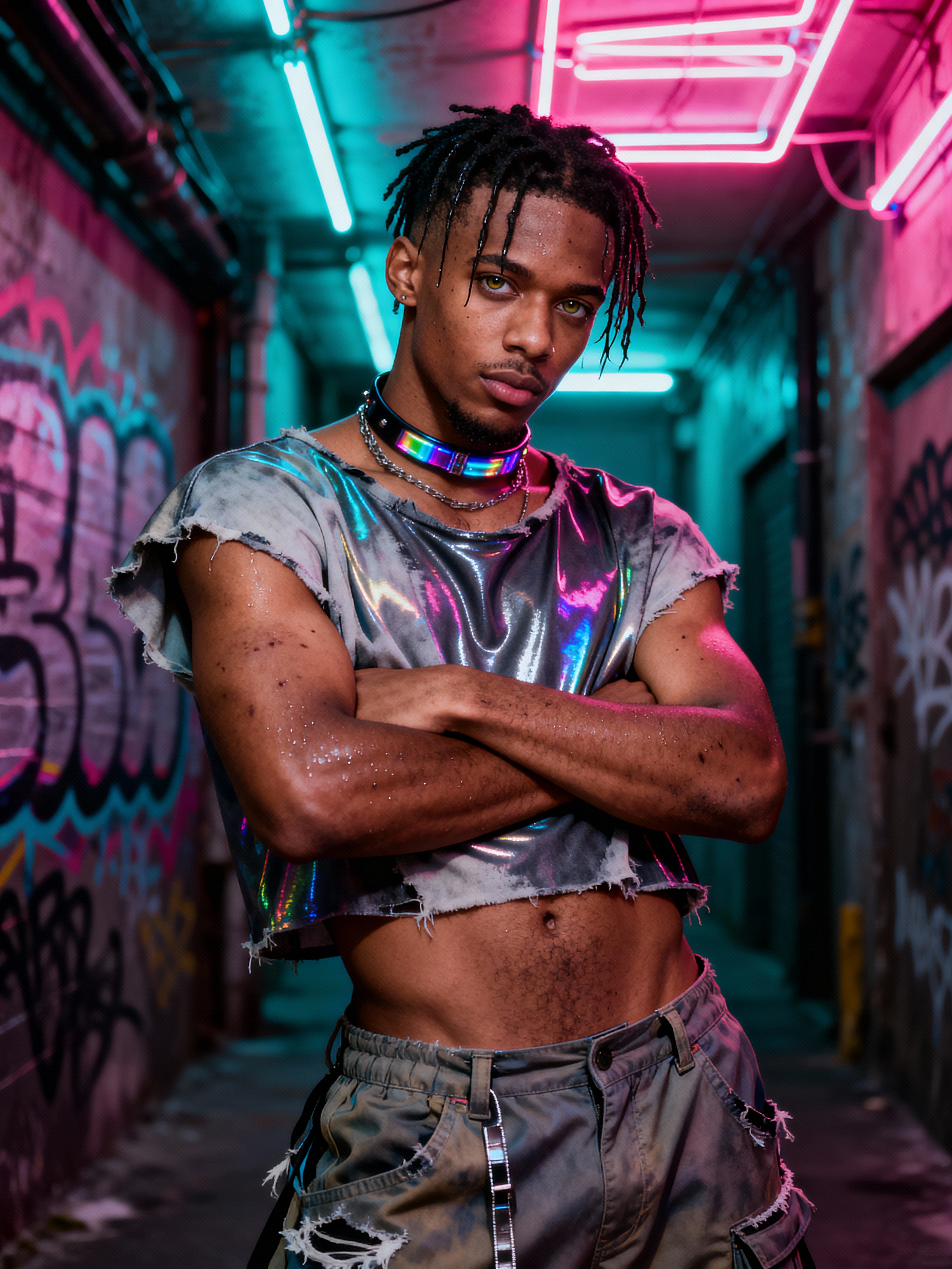 model wearing Y2K aesthetic, 2000s fashion, aughts style, noughties style, grunge or 2000s style, oversized washed out style, baggy pants, low rise pants or cargo pants, crop top, Choker, metallic glossy, iridescent fabrics, posing for photo