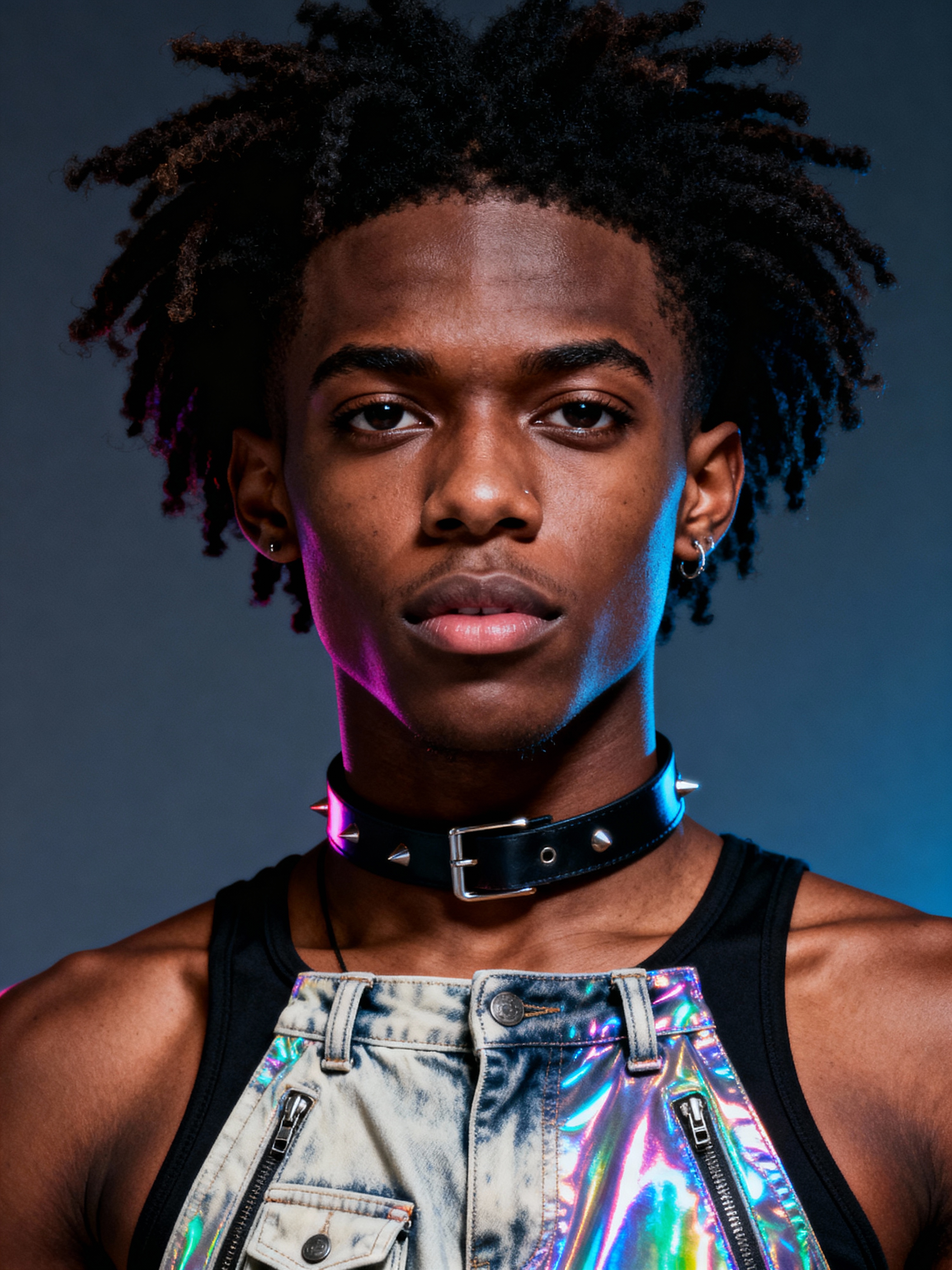 model wearing Y2K aesthetic, 2000s fashion, aughts style, noughties style, grunge or 2000s style, oversized washed out style, baggy pants, low rise pants or cargo pants, crop top, Choker, metallic glossy, iridescent fabrics, posing for photo