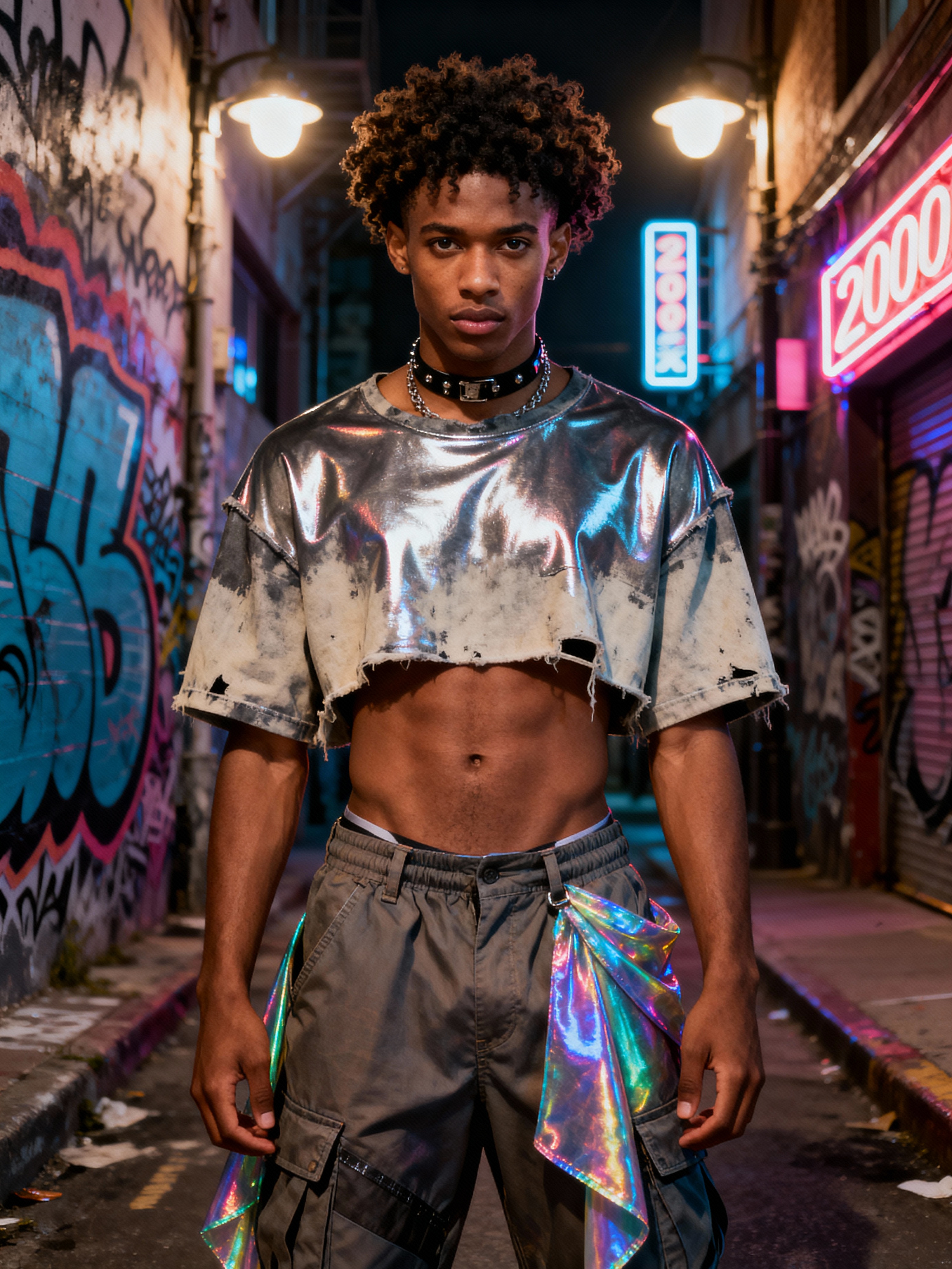 model wearing Y2K aesthetic, 2000s fashion, aughts style, noughties style, grunge or 2000s style, oversized washed out style, baggy pants, low rise pants or cargo pants, crop top, Choker, metallic glossy, iridescent fabrics, posing for photo