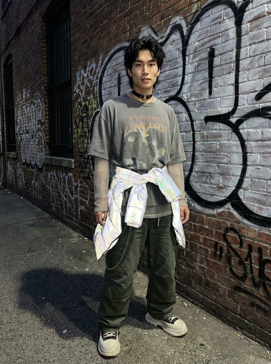 model wearing Y2K aesthetic, 2000s fashion, aughts style, noughties style, grunge or 2000s style, oversized washed out style, baggy pants, low rise pants or cargo pants, crop top, Choker, metallic glossy, iridescent fabrics, posing for photo