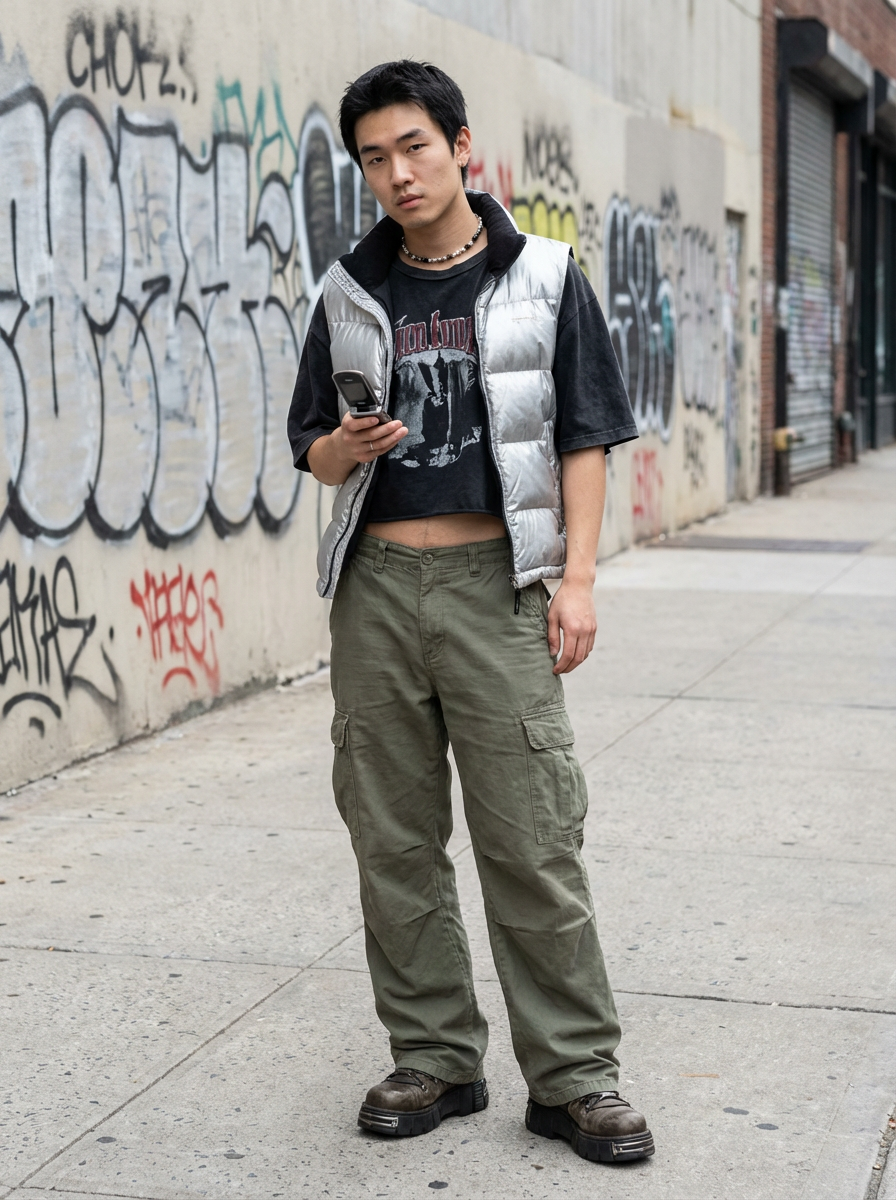 model wearing Y2K aesthetic, 2000s fashion, aughts style, noughties style, grunge or 2000s style, oversized washed out style, baggy pants, low rise pants or cargo pants, crop top, Choker, metallic glossy, iridescent fabrics, posing for photo