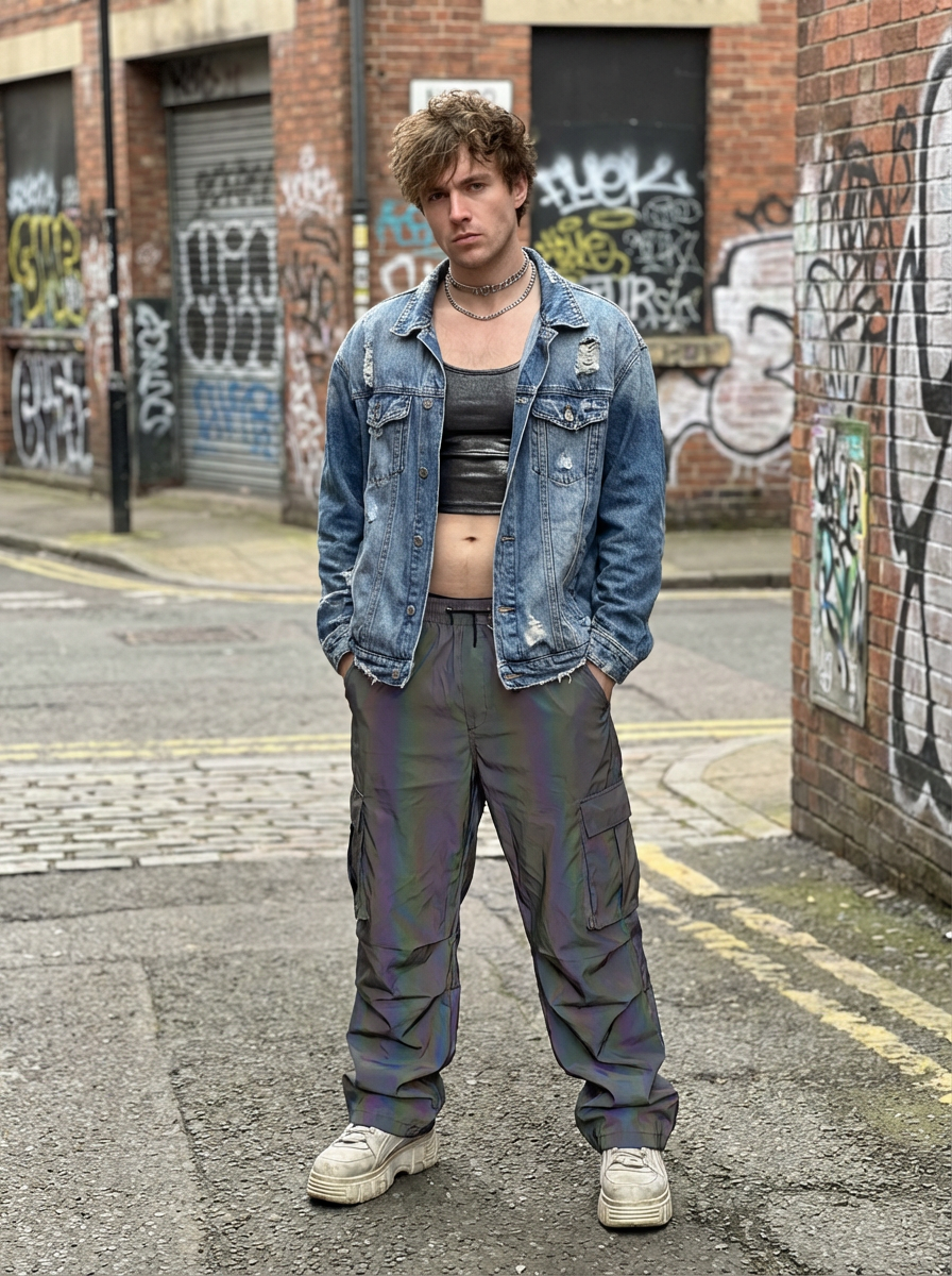 model wearing Y2K aesthetic, 2000s fashion, aughts style, noughties style, grunge or 2000s style, oversized washed out style, baggy pants, low rise pants or cargo pants, crop top, Choker, metallic glossy, iridescent fabrics, posing for photo