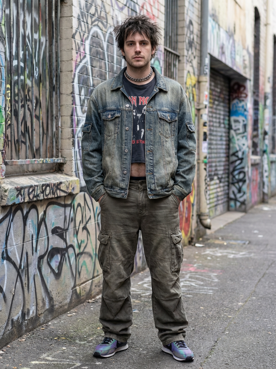 model wearing Y2K aesthetic, 2000s fashion, aughts style, noughties style, grunge or 2000s style, oversized washed out style, baggy pants, low rise pants or cargo pants, crop top, Choker, metallic glossy, iridescent fabrics, posing for photo