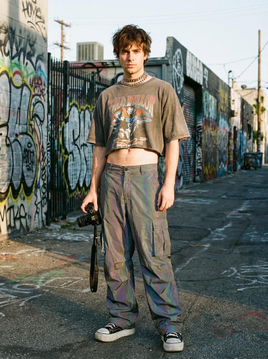 model wearing Y2K aesthetic, 2000s fashion, aughts style, noughties style, grunge or 2000s style, oversized washed out style, baggy pants, low rise pants or cargo pants, crop top, Choker, metallic glossy, iridescent fabrics, posing for photo
