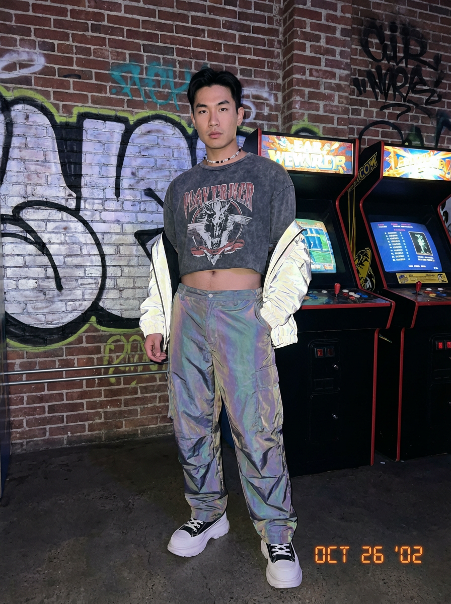 model wearing Y2K aesthetic, 2000s fashion, aughts style, noughties style, grunge or 2000s style, oversized washed out style, baggy pants, low rise pants or cargo pants, crop top, Choker, metallic glossy, iridescent fabrics, posing for photo