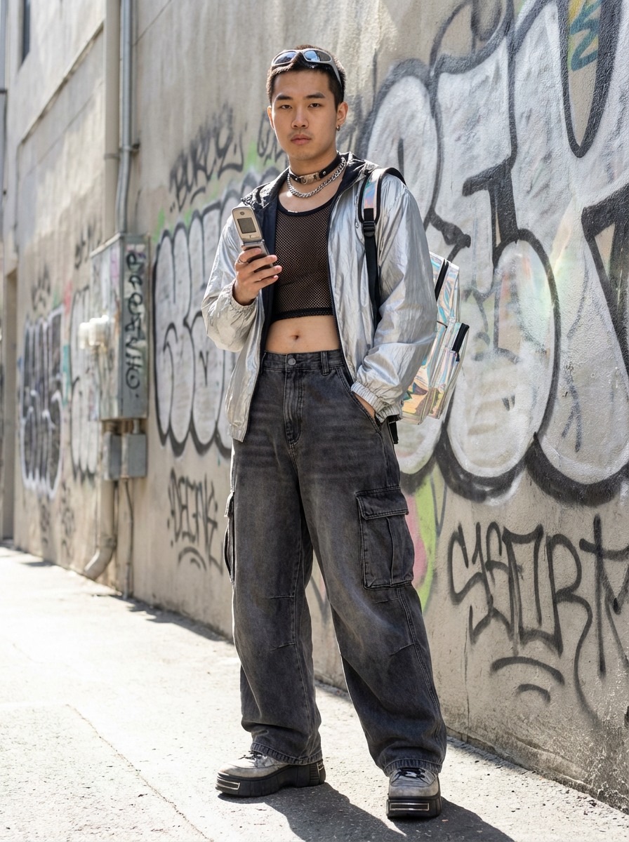 model wearing Y2K aesthetic, 2000s fashion, aughts style, noughties style, grunge or 2000s style, oversized washed out style, baggy pants, low rise pants or cargo pants, crop top, Choker, metallic glossy, iridescent fabrics, posing for photo