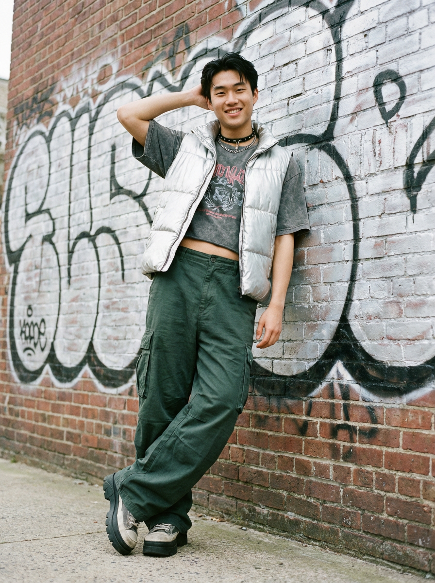 model wearing Y2K aesthetic, 2000s fashion, aughts style, noughties style, grunge or 2000s style, oversized washed out style, baggy pants, low rise pants or cargo pants, crop top, Choker, metallic glossy, iridescent fabrics, posing for photo