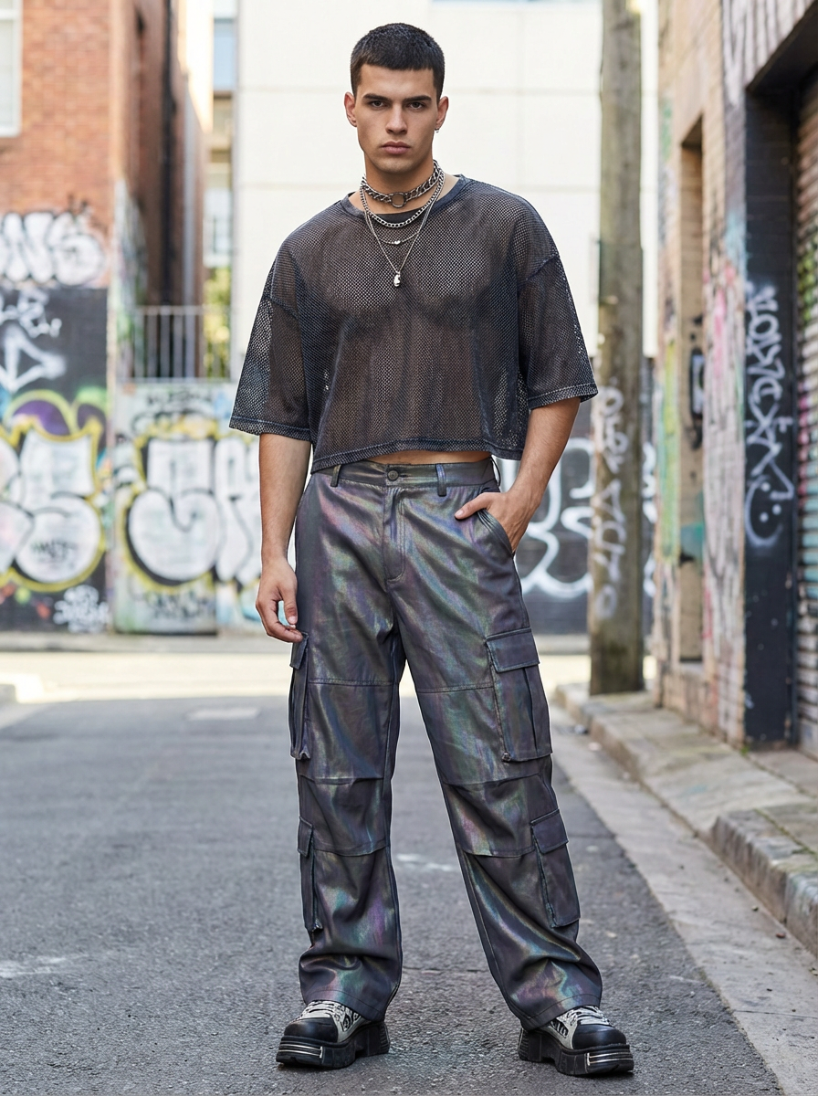 model wearing Y2K aesthetic, 2000s fashion, aughts style, noughties style, grunge or 2000s style, oversized washed out style, baggy pants, low rise pants or cargo pants, crop top, Choker, metallic glossy, iridescent fabrics, posing for photo