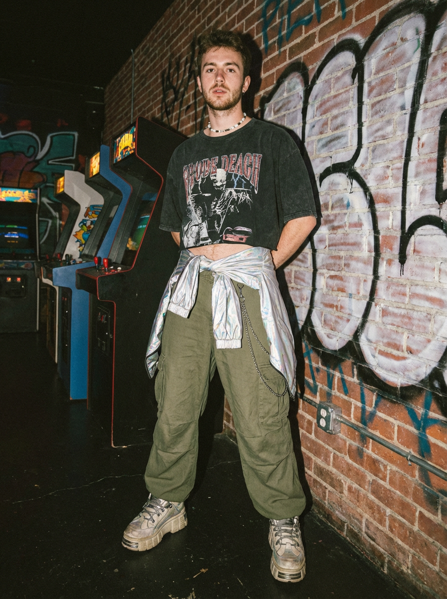 model wearing Y2K aesthetic, 2000s fashion, aughts style, noughties style, grunge or 2000s style, oversized washed out style, baggy pants, low rise pants or cargo pants, crop top, Choker, metallic glossy, iridescent fabrics, posing for photo
